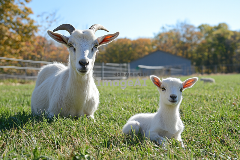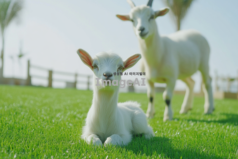 흰색 아기 산양(baby goat)은 초록 잔디에 앉아있는 모습