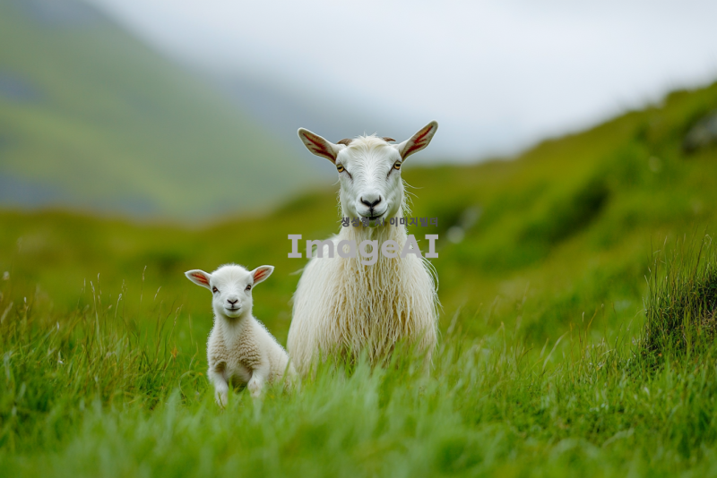 정면을 바라보고 서있는 흰색 어미 산양(goat)과