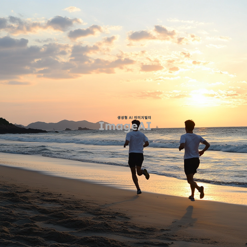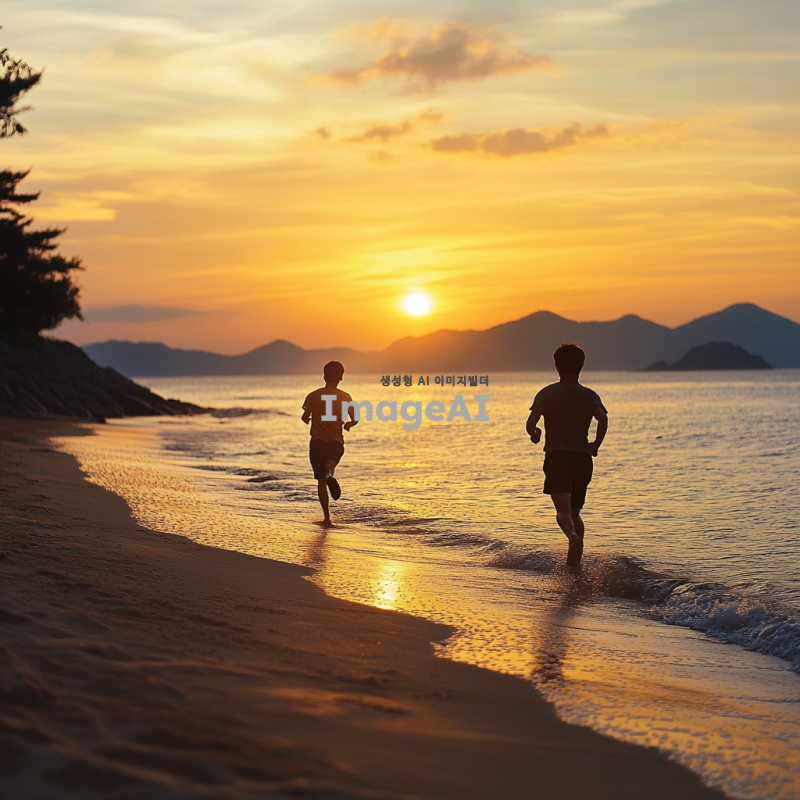 바닷가에서 뛰어다니는 한국인 남자 두 명, 배경에는 황금빛 노을이 지고 있으며, 하늘은 오렌지와 핑크빛으로 물들어 있음. 바다의 잔잔한 파도와 모래사장이 조화를 이루며, 남자들은 즐거운 표정으로 활기차게 움직이고 있음. 자연스럽고 생동감 있는 장면, 따뜻하고 평화로운 분위기.