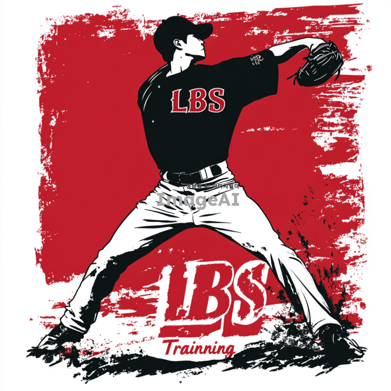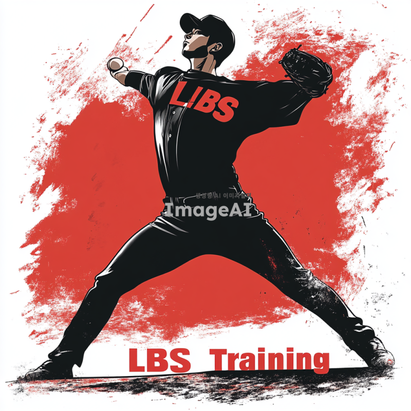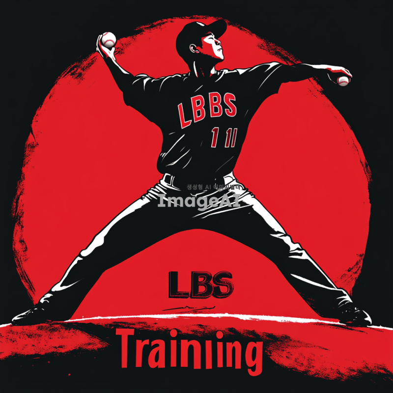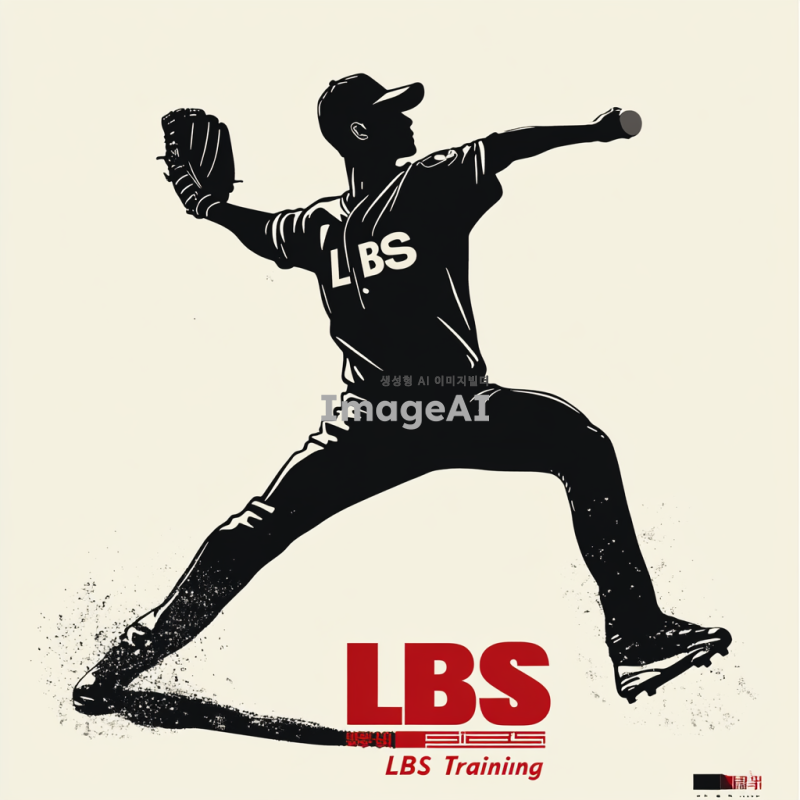 검정 실루엣으로 표현된 한국인 투수가 투구하는 모습. 유니폼에 작게 삽입된 "LBS" 글자. 유니폼 하단에는 큰 빨간색 글자로 "LBS Training"이 명확하게 보이도록 삽입. 전체적으로 깔끔하고 명료한 디자인, 류현진의 투구 동작처럼 우아하고 매끄러운 투수의 모습.