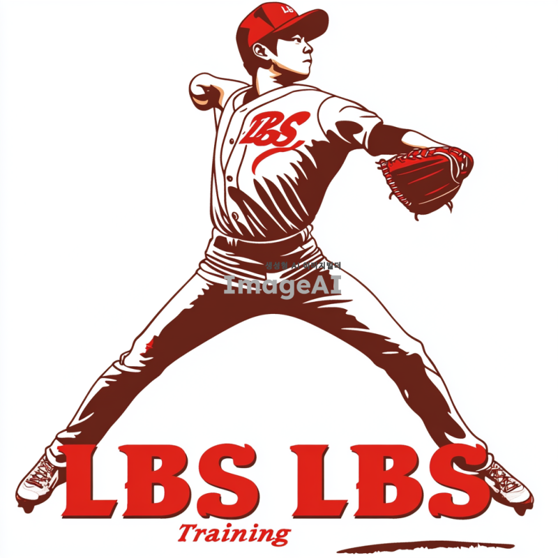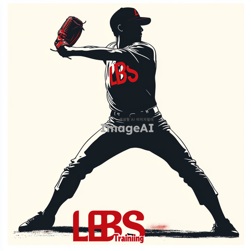 와인드업 자세를 취하는 한국인 투수의 검정색 실루엣, 유니폼에 작게 "LBS" 삽입. 실루엣 아래에 "LBS Training"을 큰 빨간색 글자로 한 줄로 삽입. 그림은 사실적이면서도 간단하고 명료하게 표현.