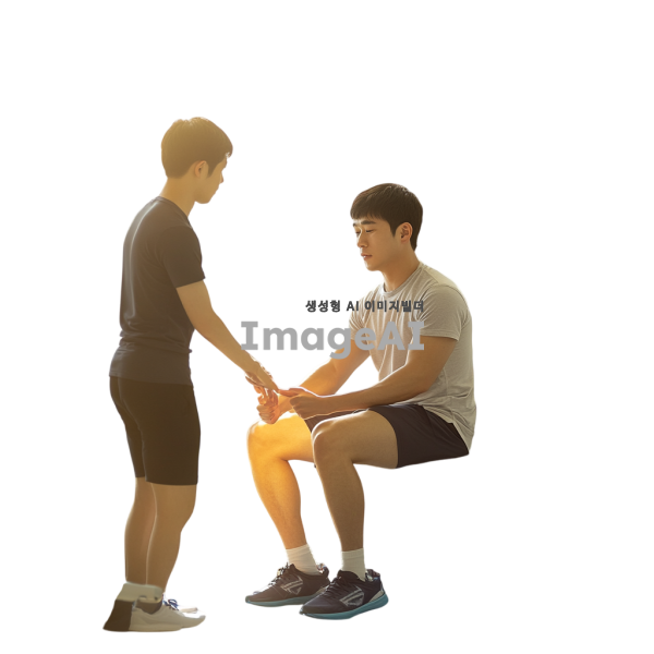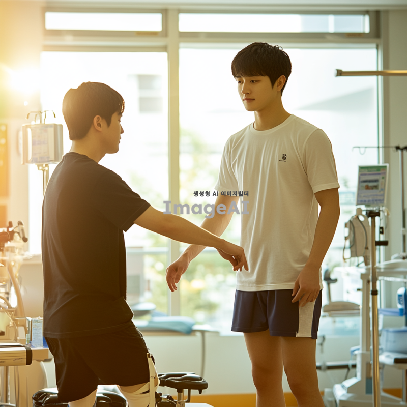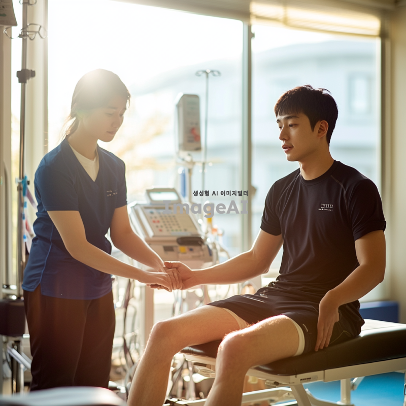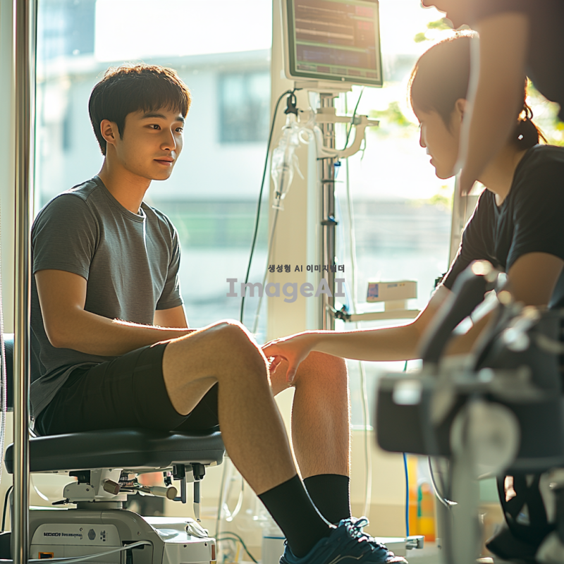 밝은 병원 환경에서 물리 치료를 받는 젊은 한국 남성, 다리 근육 강화 운동을 하는 모습. 물리 치료사는 친절하고 전문적인 태도로 환자를 돕고 있으며, 주변에는 다양한 재활 장비들이 놓여 있다. 환자는 집중하며 운동에 임하고 있으며, 배경에는 창문을 통해 햇살이 들어와 따뜻한 분위기를 연출한다.