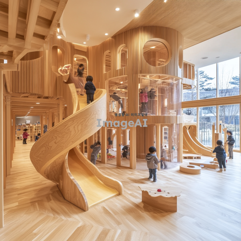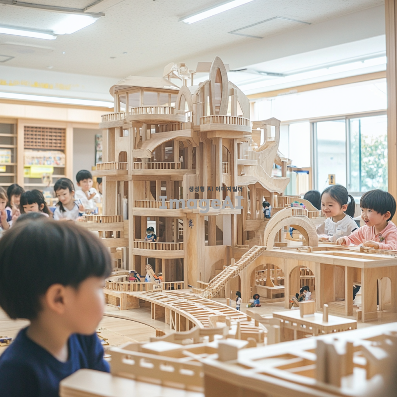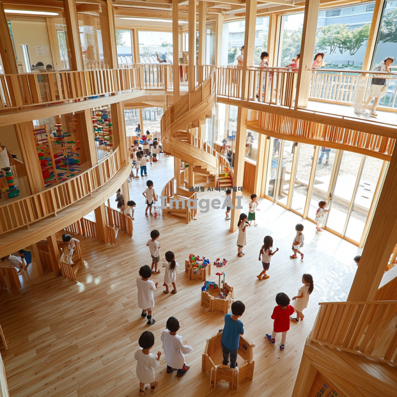 초등학교 영재 아이들이 나무 카프라로 쌓은 4층 높이의 건물과 전망대, 곡선의 아름다움을 강조한 디자인, 창의적이고 독창적인 구조, 자연스러운 나무의 색감과 질감을 살린 모습, 아이들이 즐겁게 참여하는 모습, 밝고 활기찬 분위기.