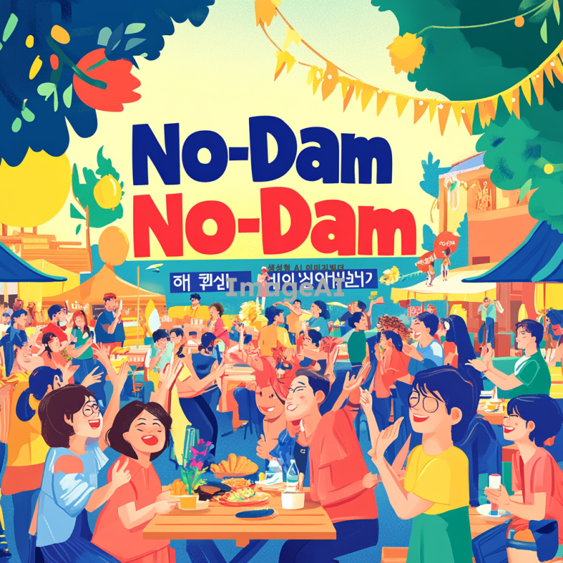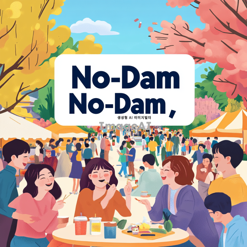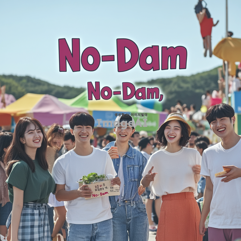 밝고 경쾌한 축제 분위기의 배경, 다양한 연령대의 한국인들이 함께 웃으며 즐기는 모습. 중앙에 "노담노담"이라는 큰 글씨로 로고 디자인, 담배를 피우지 않는 건강한 삶을 강조하는 이미지. 담배를 거부하는 젊은이들의 긍정적인 모습, 깨끗한 공기와 건강한 생활을 상징하는 자연 요소들 포함. 밝은 색상 팔레트 사용, 희망과 긍정의 메시지를 전달하는 텍스트 배치.