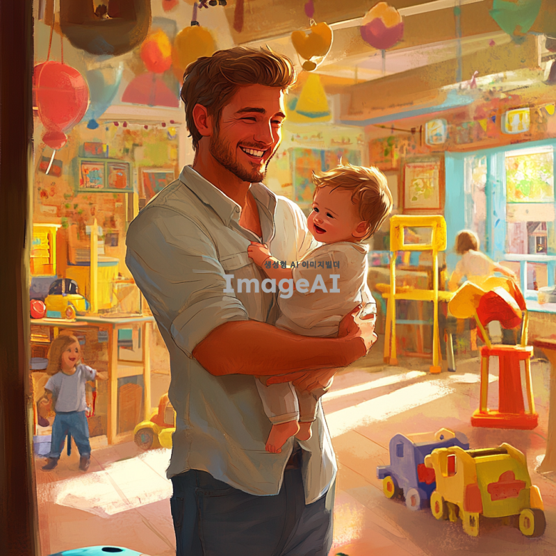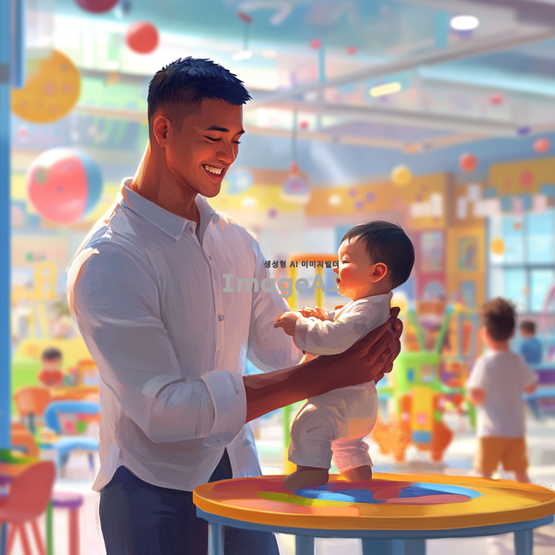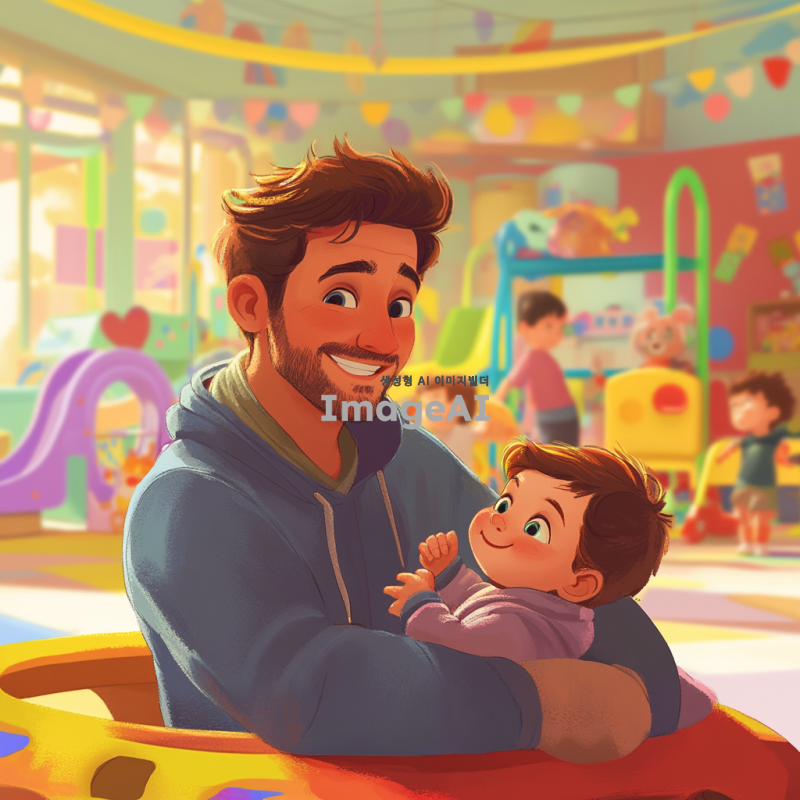 밝고 활기찬 키즈카페 내부에서 아기를 돌보고 있는 젊은 아빠, 주변에는 다양한 색상의 놀이기구와 장난감들이 가득하며, 아빠는 아기를 보며 미소짓고 있다. 아빠는 캐주얼한 옷을 입고 있으며, 배경은 아이들이 뛰어노는 모습을 담고 있다. 애니메이션 스타일로 표현된 장면, 따뜻하고 친근한 분위기.