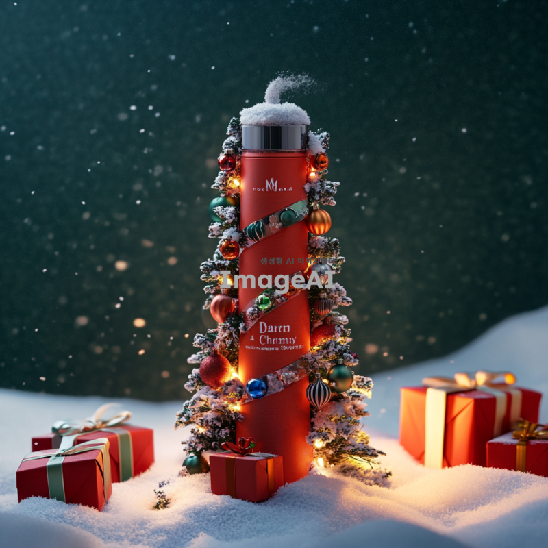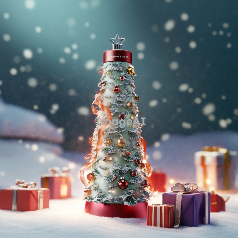 크리스마스 트리로 장식된 제품을 중심으로, 눈이 내리는 겨울 풍경 속에서 따뜻한 조명과 함께 반짝이는 장식들이 어우러진 장면. 트리에는 다양한 크리스마스 장식품과 리본이 걸려 있으며, 주변에는 선물 상자들이 놓여 있어 크리스마스의 따뜻하고 즐거운 분위기를 강조.
