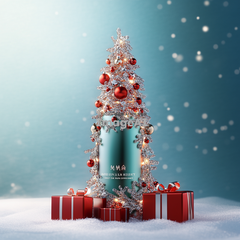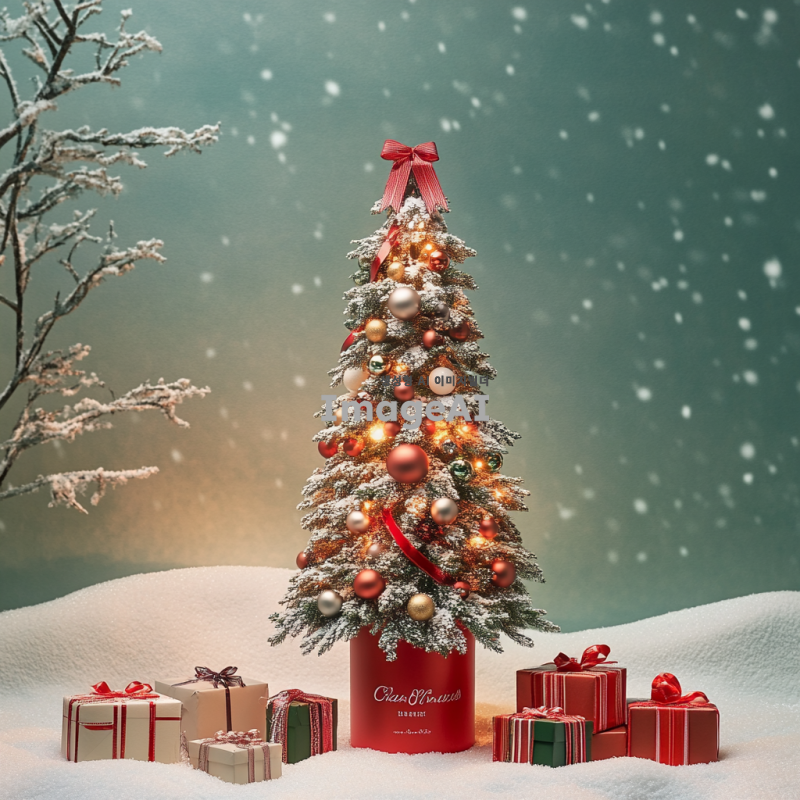 눈이 내리는 겨울 풍경 속에서 크리스마스 트리로 장식된 제품을 중심으로 한 장면. 트리는 다양한 크리스마스 장식품과 리본으로 화려하게 꾸며져 있으며, 따뜻한 조명이 트리와 장식들을 부드럽게 비추고 있다. 주변에는 다채로운 포장지로 포장된 선물 상자들이 놓여 있어 크리스마스의 따뜻하고 즐거운 분위기를 강조한다. 트리와 장식품들이 반짝이며, 눈이 부드럽게 내리는 모습이 배경을 채운다.