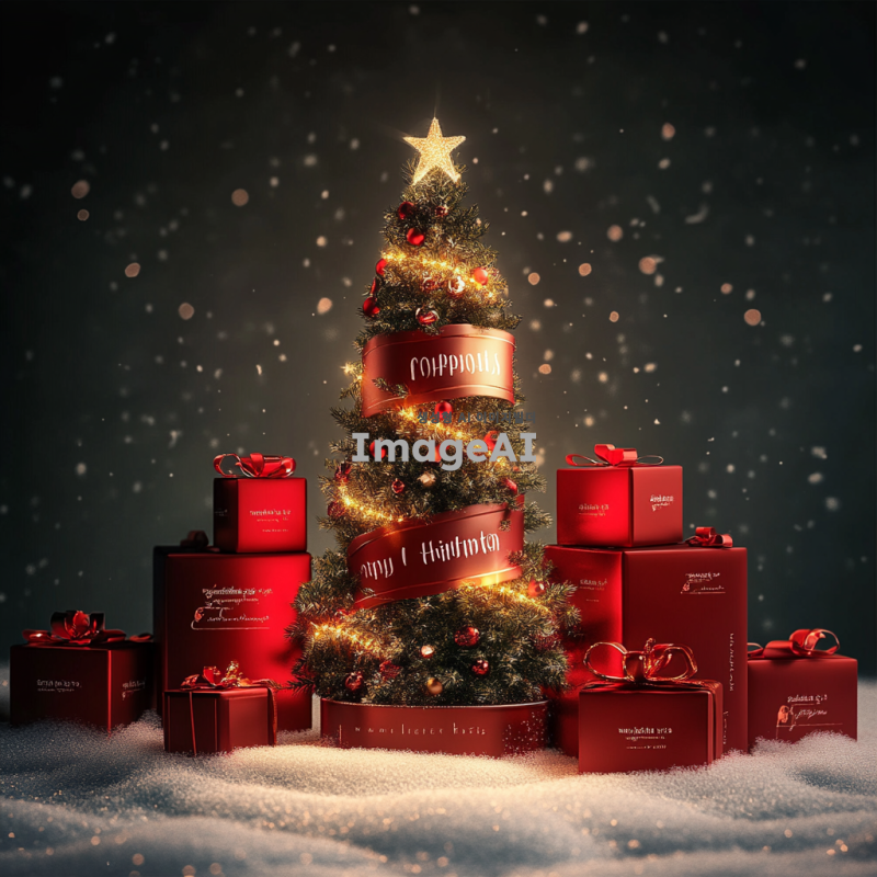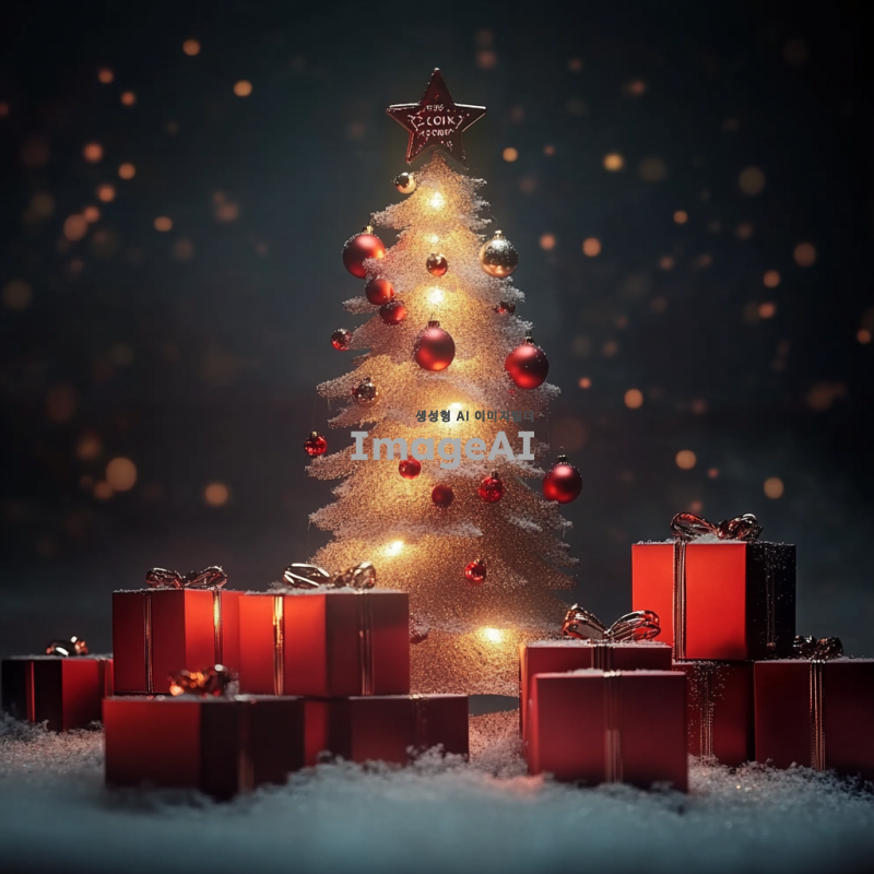 크리스마스 트리로 장식된 제품을 중심으로, 눈이 내리는 겨울 풍경 속에서 따뜻한 조명과 함께 반짝이는 장식들이 어우러진 장면. 트리에는 다양한 크리스마스 장식품과 리본이 걸려 있으며, 주변에는 선물 상자들이 놓여 있어 크리스마스의 따뜻하고 즐거운 분위기를 강조.