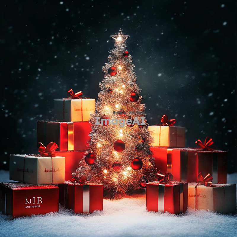 눈 내리는 겨울 풍경 속에서 크리스마스 트리로 장식된 제품이 중심에 자리잡고 있는 장면. 트리는 다양한 크리스마스 장식품과 리본으로 화려하게 꾸며져 있으며, 따뜻한 조명이 트리를 부드럽게 비추고 있다. 주변에는 여러 개의 선물 상자들이 놓여 있어 크리스마스의 따뜻하고 즐거운 분위기를 강조하고 있다. 반짝이는 장식들이 조명과 어우러져 환상적인 겨울의 느낌을 더하고 있다.