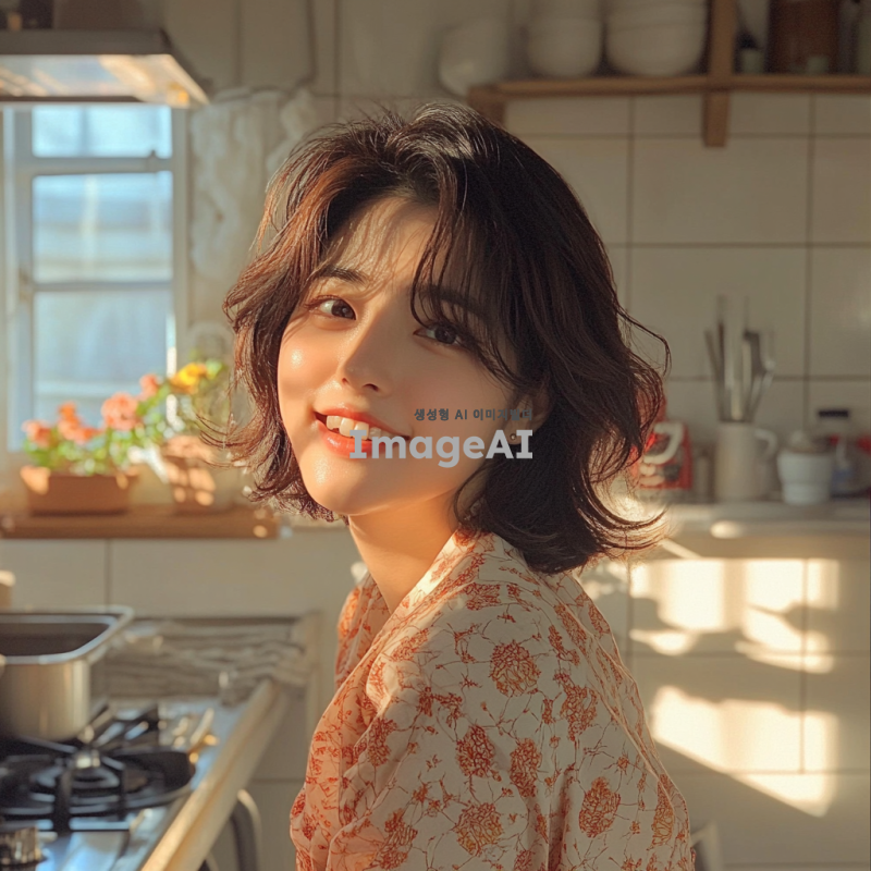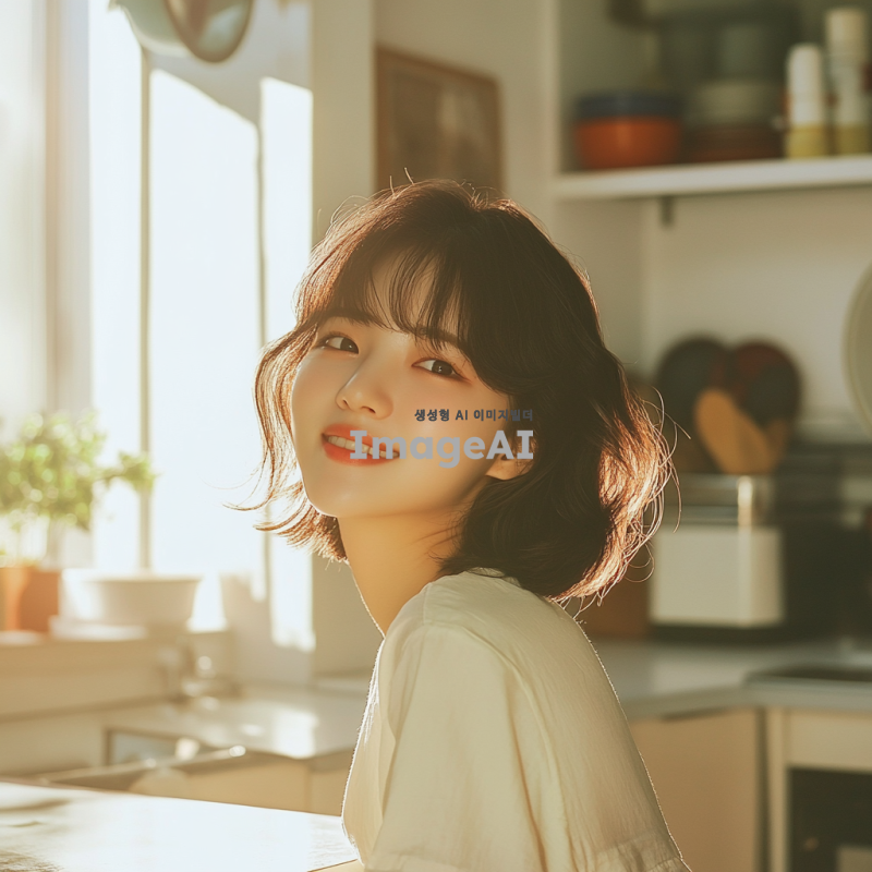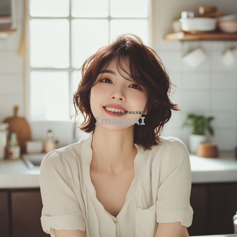 단발의 짙은 갈색 머리를 가진 한국인 여성, 부드러운 미소를 짓고 있으며 따뜻한 햇살 아래에서 자연스럽게 포즈를 취하고 있다. 그녀는 여성스러운스타일의 옷을 입고 있으며. 배경은 주방이며 전체적인 분위기는 밝고 생동감 있다.