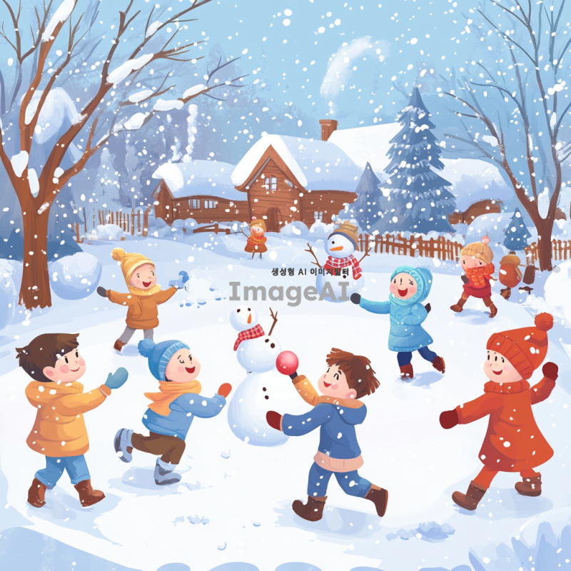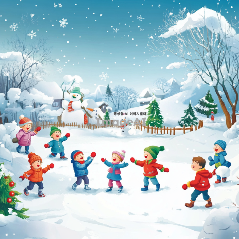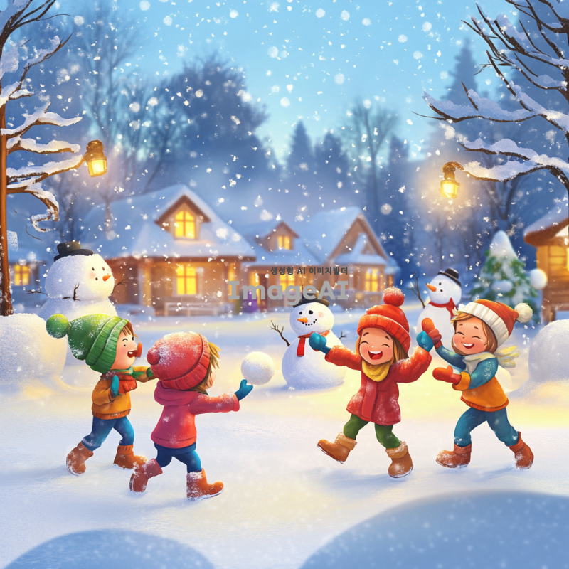 겨울 배경의 눈 덮인 마을에서 눈싸움을 즐기는 아이들, 따뜻한 옷을 입고 있는 아이들이 밝게 웃으며 눈덩이를 던지고 있는 장면, 주변에는 눈사람과 눈으로 덮인 나무들, 하늘에는 눈송이가 천천히 떨어지는 모습, 애니메이션 스타일로 귀엽고 밝게 표현된 생동감 있는 색감과 부드러운 라인, 밝고 즐거운 분위기.
