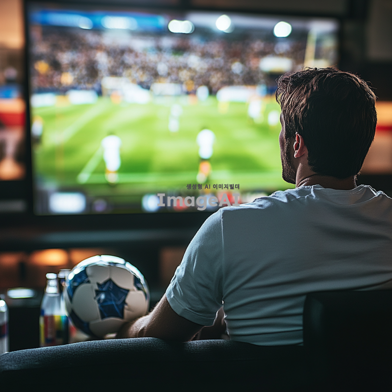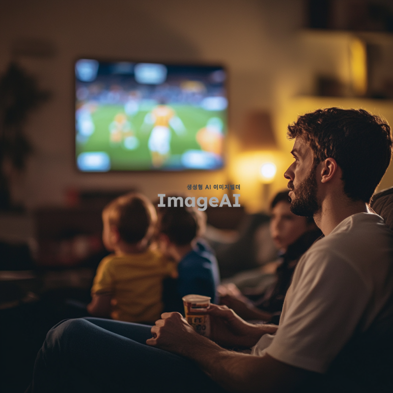 집에서 축구경기를 보는 사람들, 중간에 광고가 나와 화를 냄