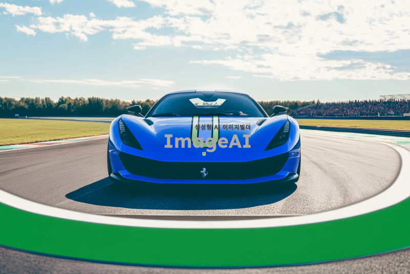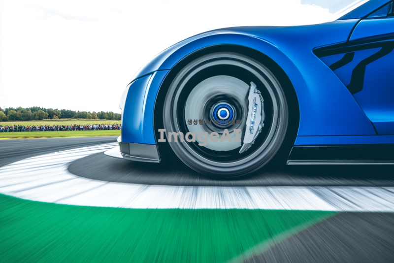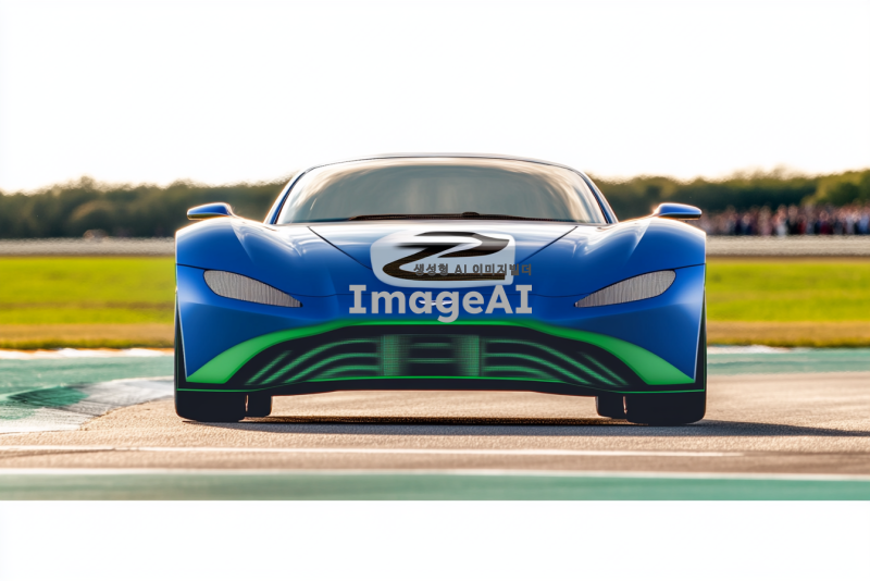 트랙 위를 달리는 현대적인 디자인의 고성능 스포츠카, 주변에는 푸른 하늘과 드넓은 초원이 펼쳐져 있으며, 차체의 윤곽이 빛을 받아 반짝이는 모습, 속도감과 역동성을 강조한 장면, 차체의 색상은 메탈릭 블루, 타이어가 땅을 강하게 움켜쥐고 있는 모습, 차량의 세부 디테일이 잘 드러나도록 가까이에서 촬영한 구도, 배경에는 관중들이 흥미롭게 지켜보는 모습.