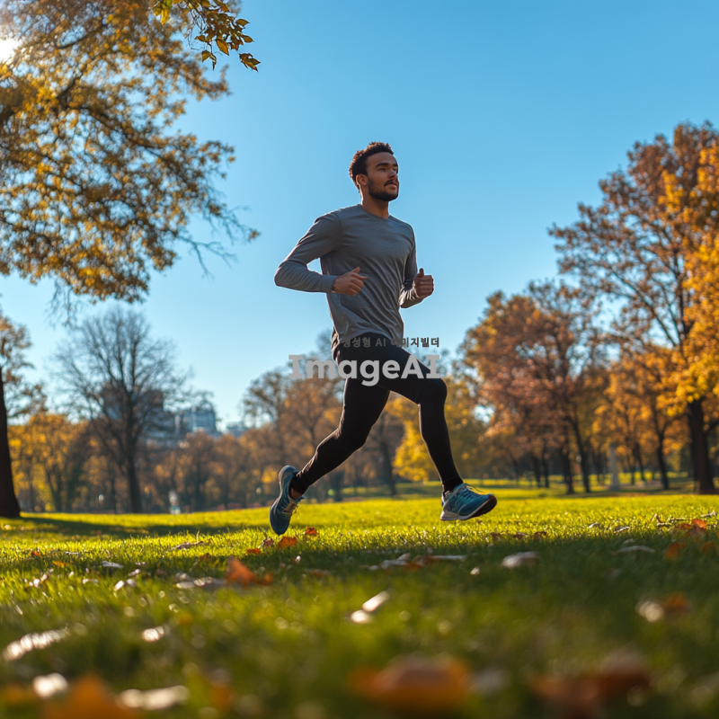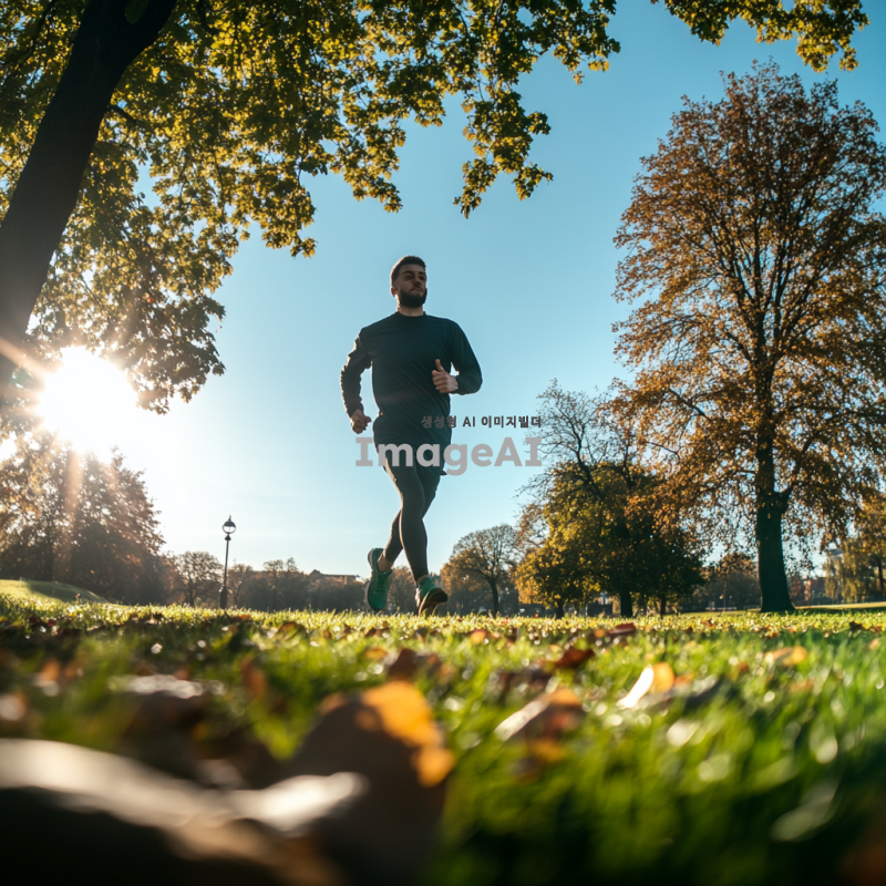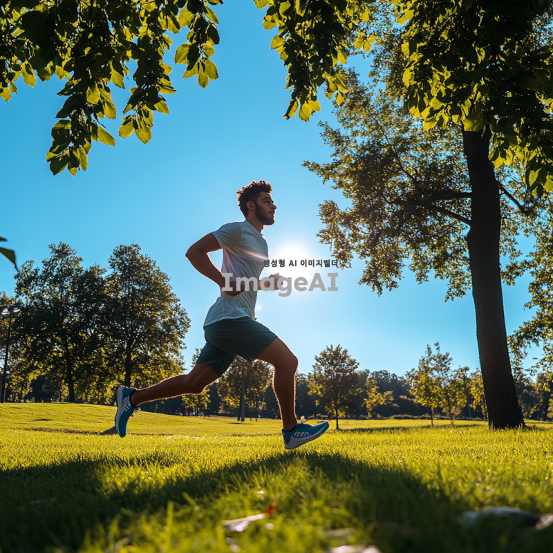 젊고 에너지가 넘치는 청년이 푸른 하늘 아래에서 운동복을 입고 활기차게 달리고 있다. 배경은 초록색 나무와 잔디가 펼쳐진 공원이며, 청년의 표정은 밝고 자신감이 넘친다. 햇빛이 그의 얼굴을 비추며 그림자는 땅에 길게 드리워져 있다. 청년의 발걸음은 가볍고 역동적이며, 주변에는 바람에 흔들리는 나뭇잎들이 보인다.