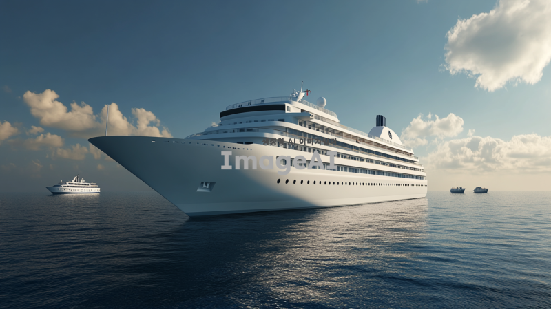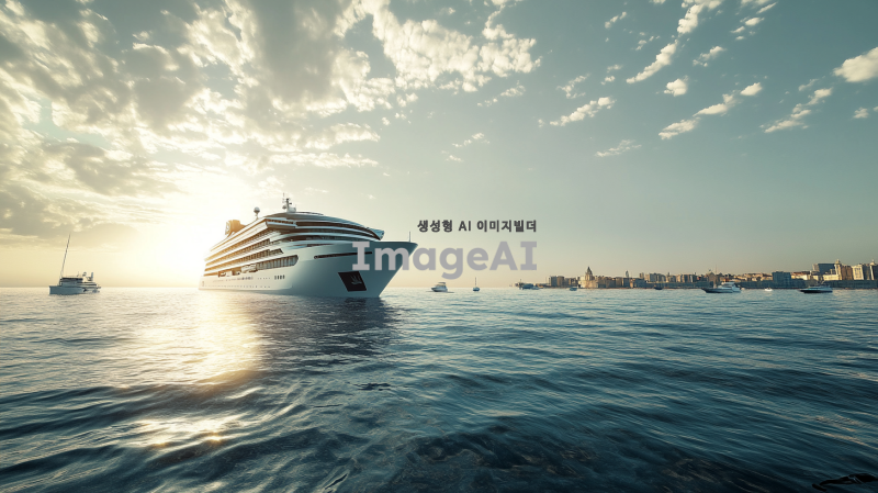 넓고 푸른 바다 위에 떠 있는 웅장한 크루즈선, 맑은 하늘과 부드러운 구름이 배경을 이루고 있으며, 햇빛이 반사되어 반짝이는 물결, 크루즈의 세부적인 외관과 갑판 위의 도시가 보이는 장면, 주변에 작은 보트와 해양 생물이 함께 어우러진 평화로운 분위기.