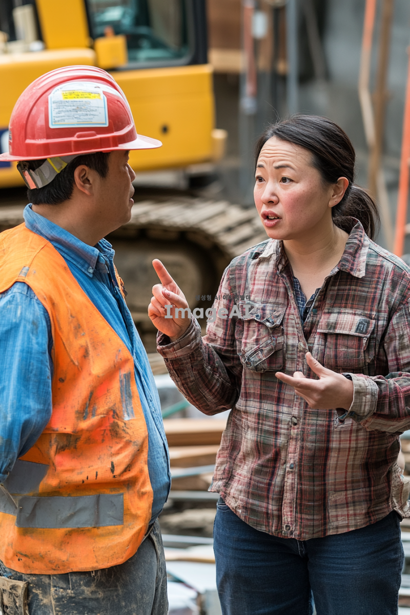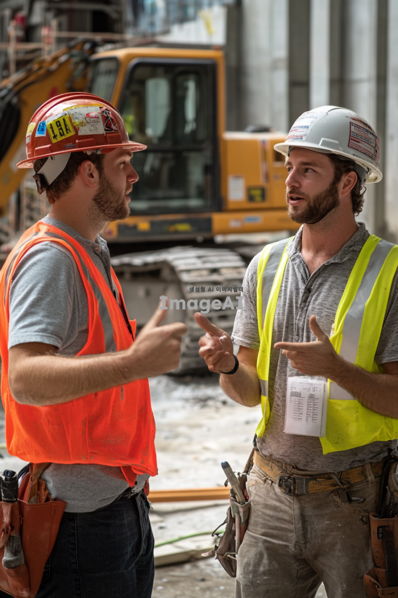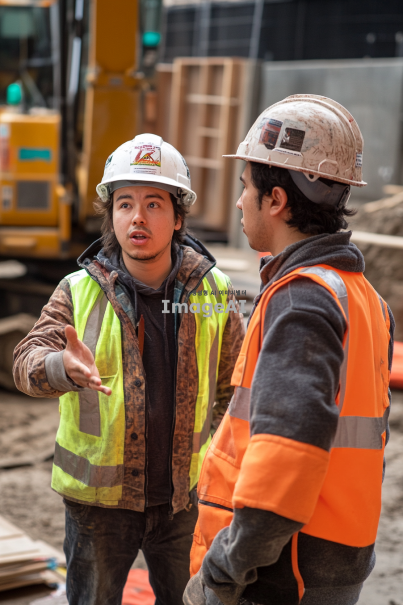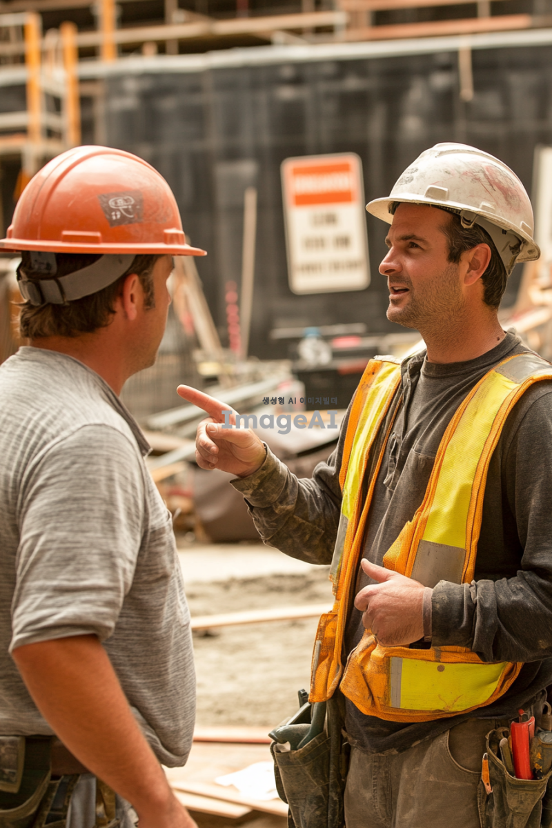배경에는 건설 장비와 안전 표지판이 보이고, 민간인은 손가락으로 특정 부분을 가리키며 설명하고 있습니다. 작업자는 헬멧과 작업복을 착용하고 있으며, 약간 당황한 표정으로 민간인의 말을 듣고 있습니다. 주변에는 공사 자재가 흩어져 있어 현장의 분위기를 잘 나타냅니다.