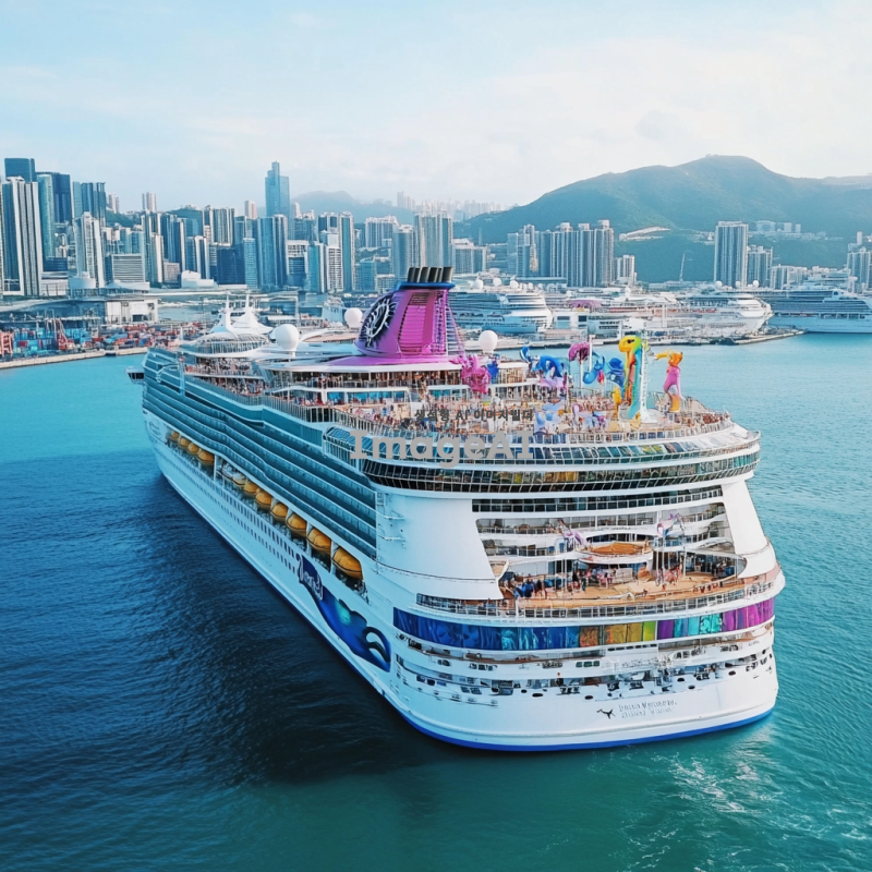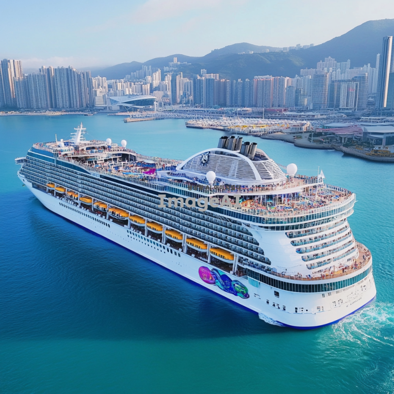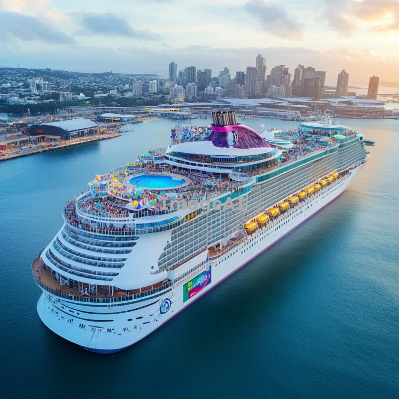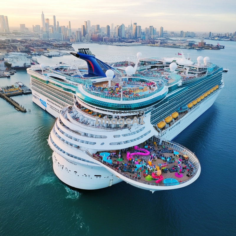 해안가에 떠있고, 갑판 위에 도시 형태가 있는 대형 크루즈