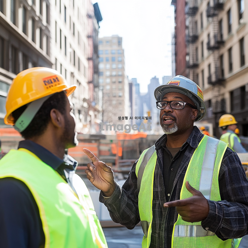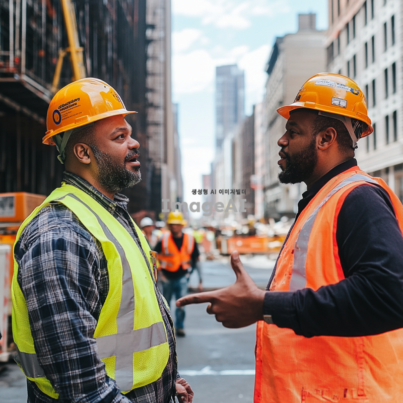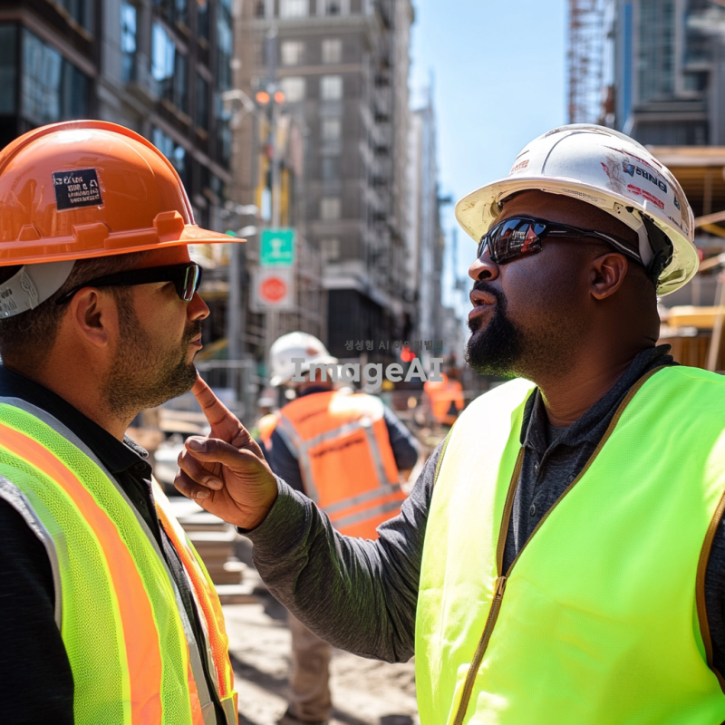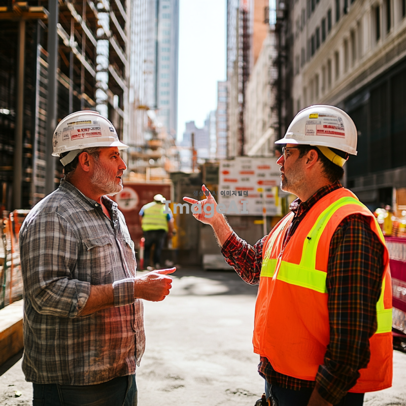 도시의 공사 현장, 헬멧을 쓴 공사 인부들이 작업 중인 모습, 남자가 손가락으로 지시하며 대화하는 장면, 배경에 건설 중인 건물과 안전 표지판, 햇빛이 비추는 낮 시간대, 안전 조끼를 입은 인부들, 남자는 캐주얼한 복장, 진지한 표정으로 대화하는 상황.
