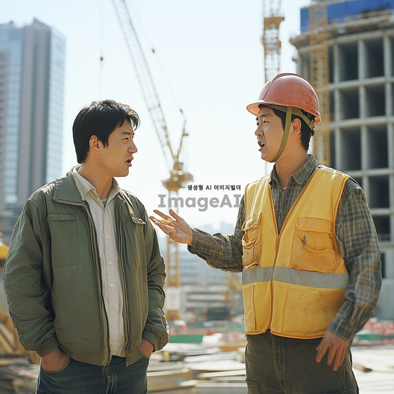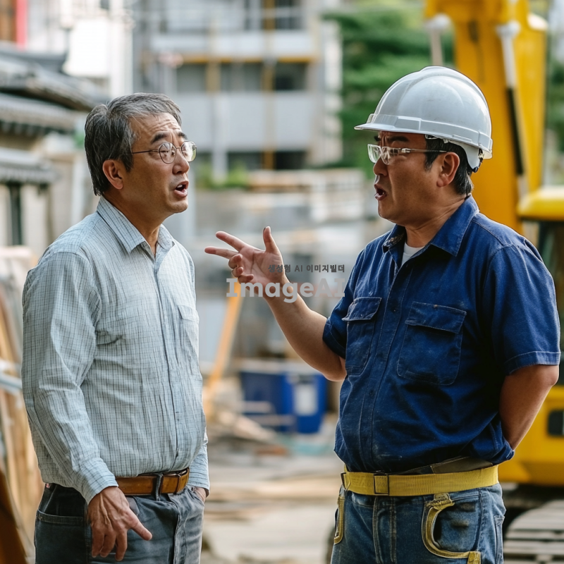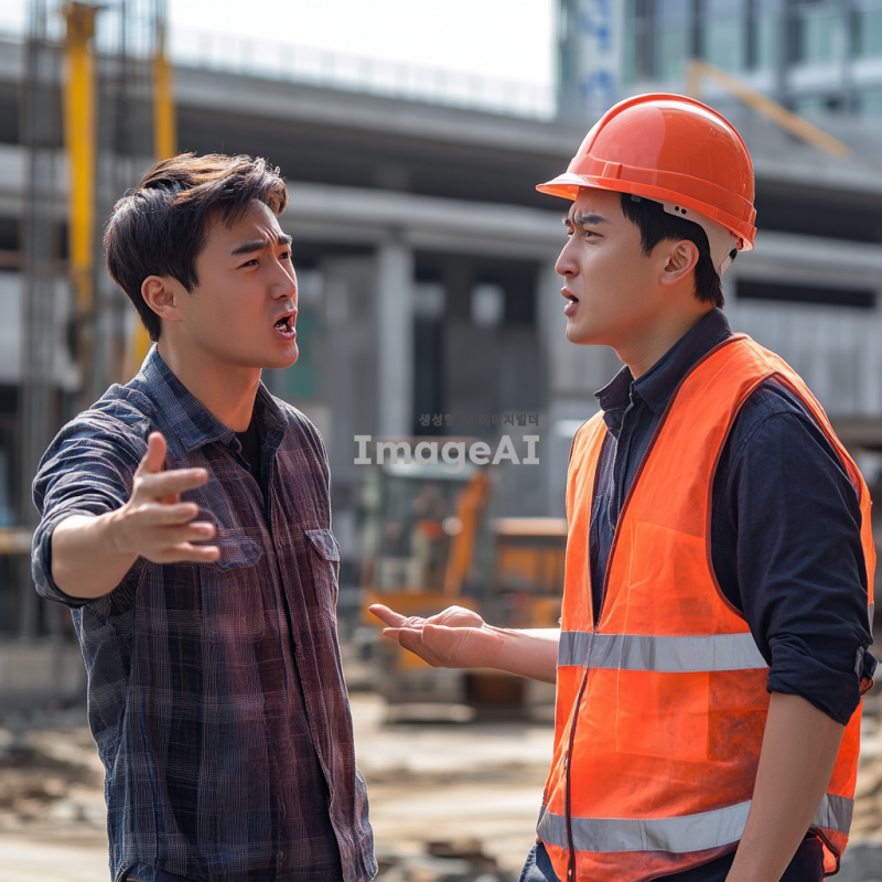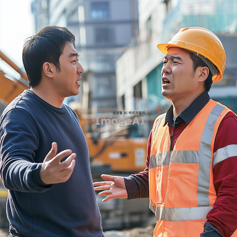 한국인 남자가 공사 현장에서 캐주얼한 복장을 입고 공사 인부에게 손짓으로 지적하고 있다. 공사 인부는 작업복과 안전모를 착용하고 있으며, 화가 난 표정으로 대응하고 있다. 주변에는 건설 장비와 건물이 공사 중인 배경이 보인다.