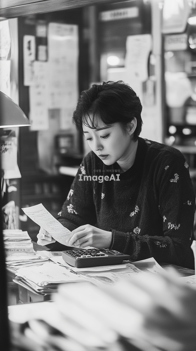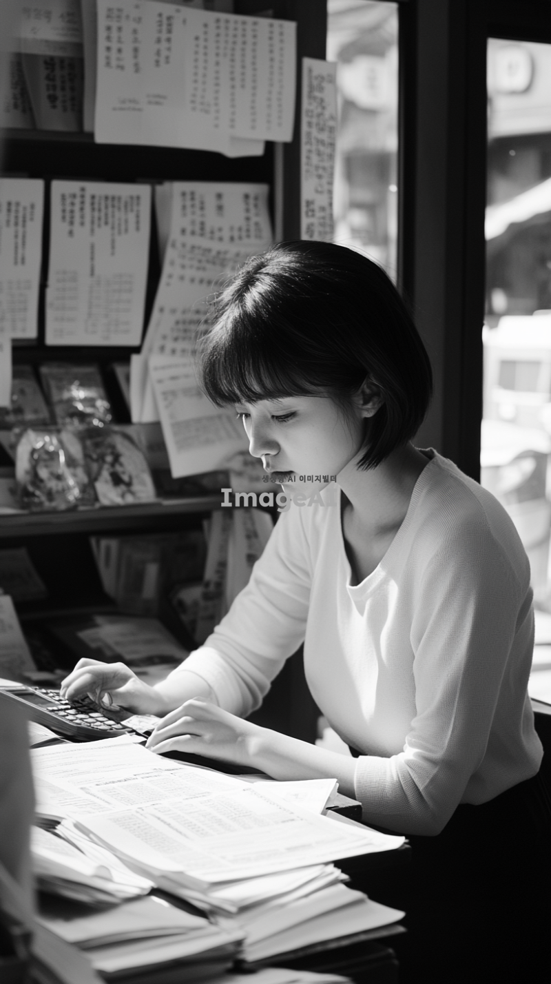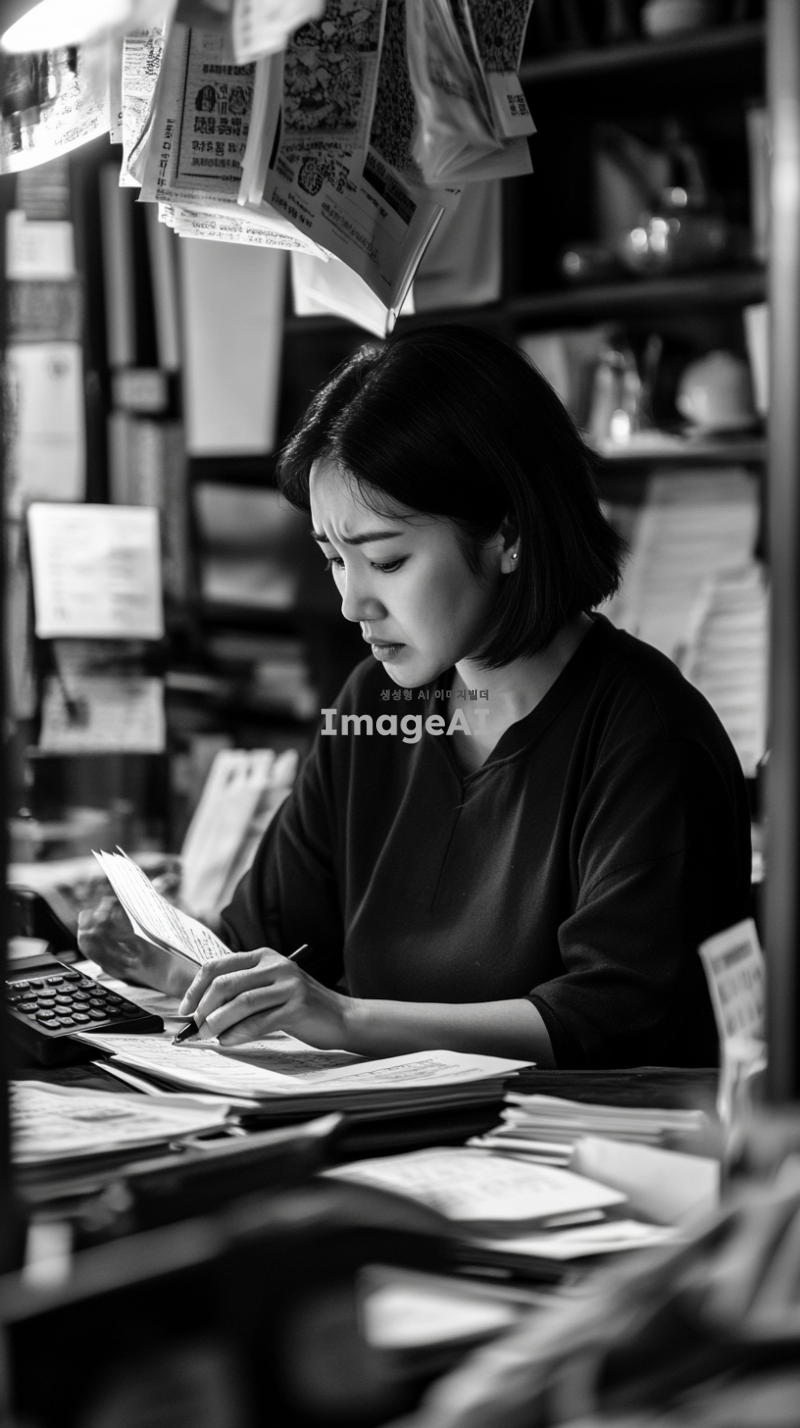 한국 여성 소상공인 사장님이 가게 안에서 돈 문제로 고민하는 모습, 흑백 톤, 사장님은 30대 중반, 짧은 머리, 캐주얼한 옷차림, 책상 위에는 서류와 계산기, 깊은 생각에 잠긴 표정, 가게 내부는 전통적인 한국 소품들로 꾸며져 있음, 창문을 통해 부드러운 자연광이 들어오는 장면