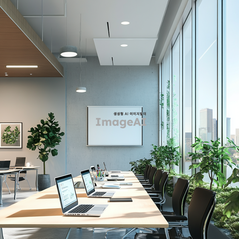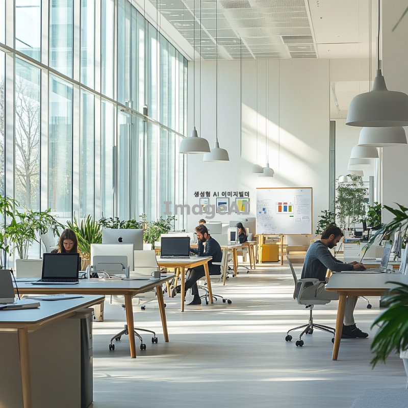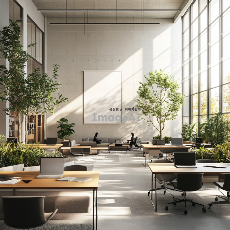 현대적인 오피스 공간, 넓은 창문으로 자연광이 들어오는 밝은 실내, 깔끔하고 세련된 가구 배치, 책상 위에는 노트북과 문서들이 정돈되어 있음, 벽에는 미니멀한 아트워크가 걸려 있고, 화분들이 곳곳에 배치되어 있어 녹색의 생기를 더함, 직원들이 협업하는 모습, 회의실에는 화이트보드와 빔프로젝터가 준비되어 있음, 전체적으로 차분하고 전문적인 분위기.