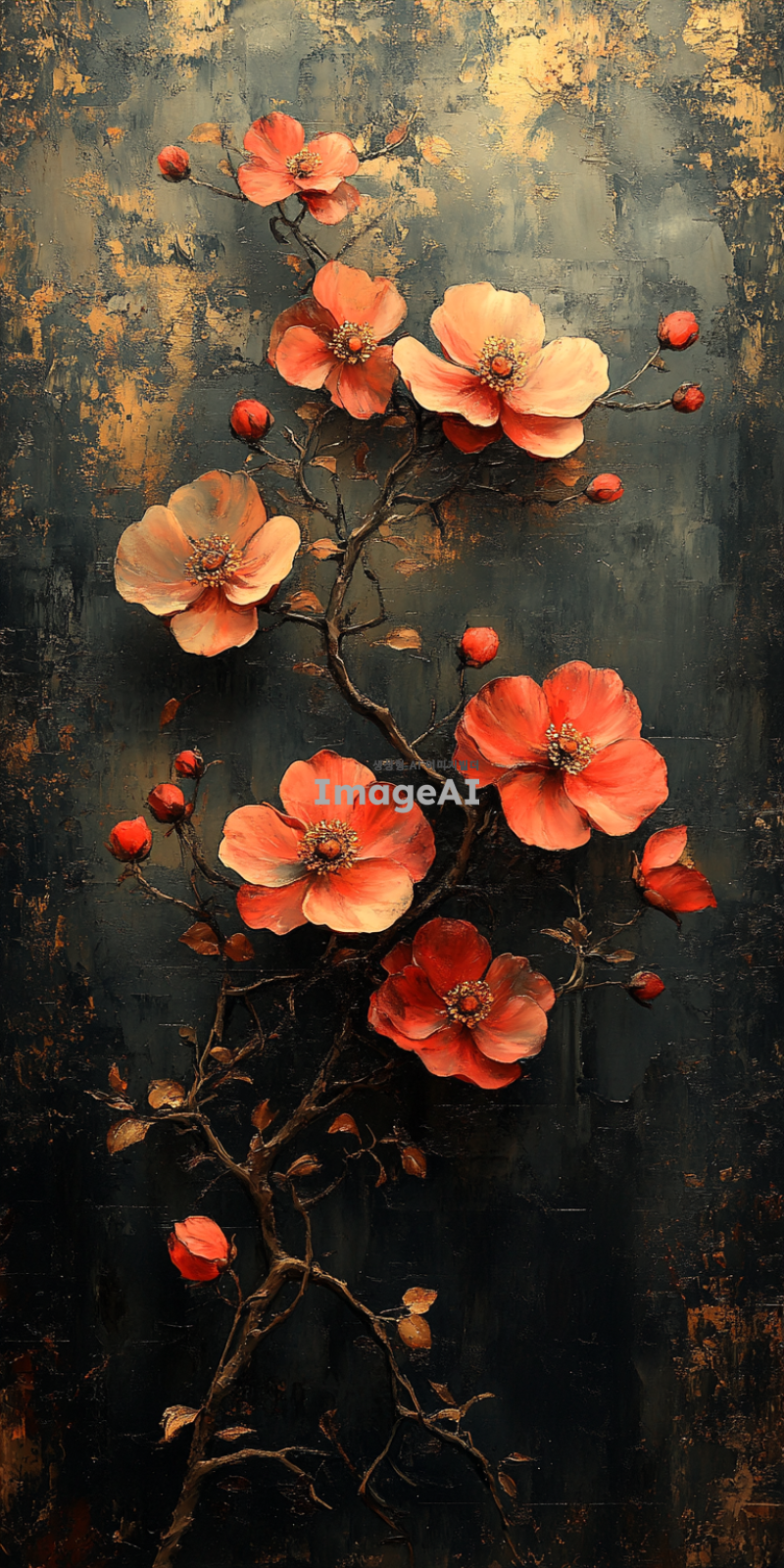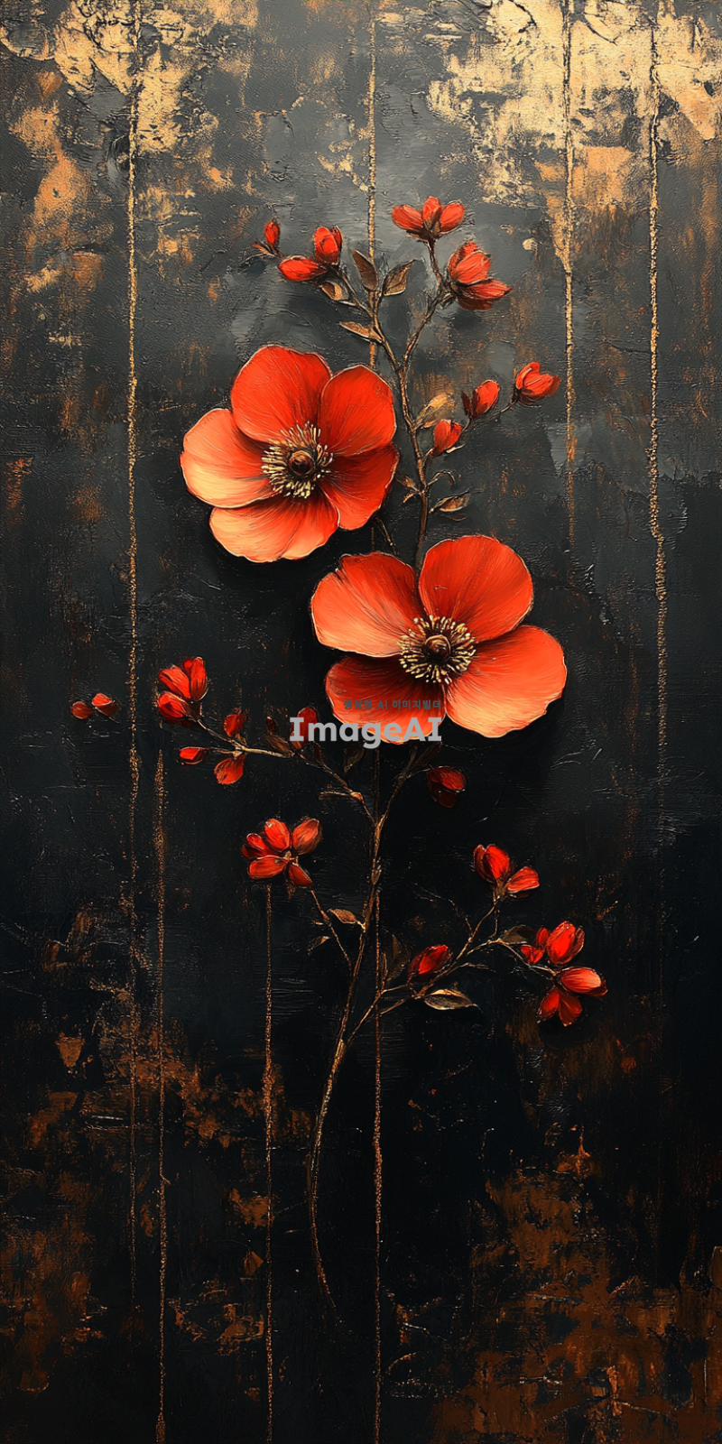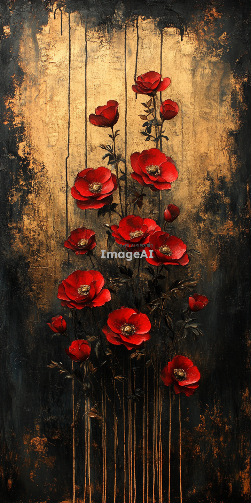 검은색 배경에 르네상스 화풍으로 금장식과 붉은 꽃을 그린 그림. 물감으로 질감 있게 표현된 붓질감과 투박한 느낌을 강조하여 세밀하게 묘사된 금장식과 생동감 있는 붉은 꽃을 중심으로 한 작품.