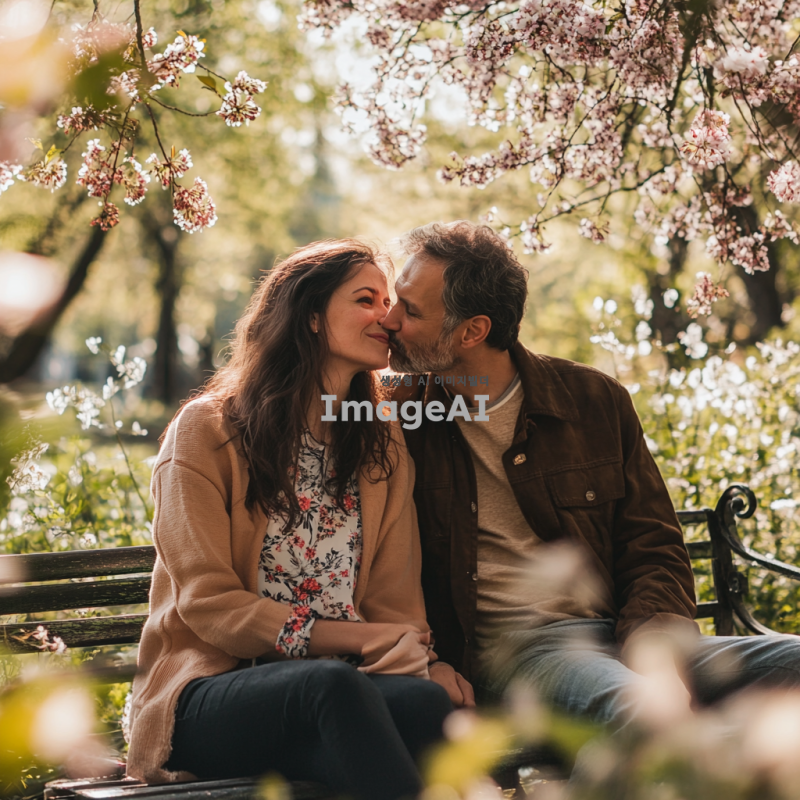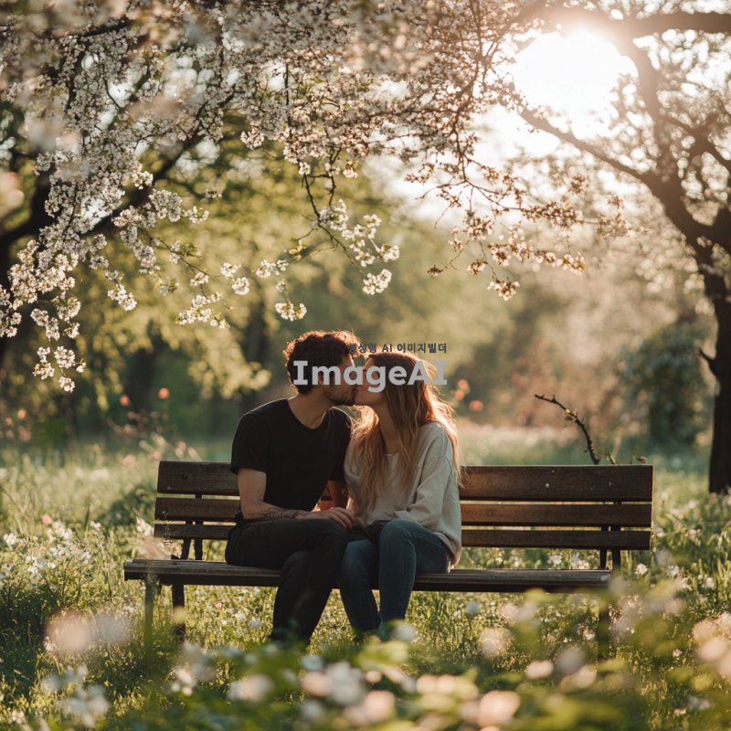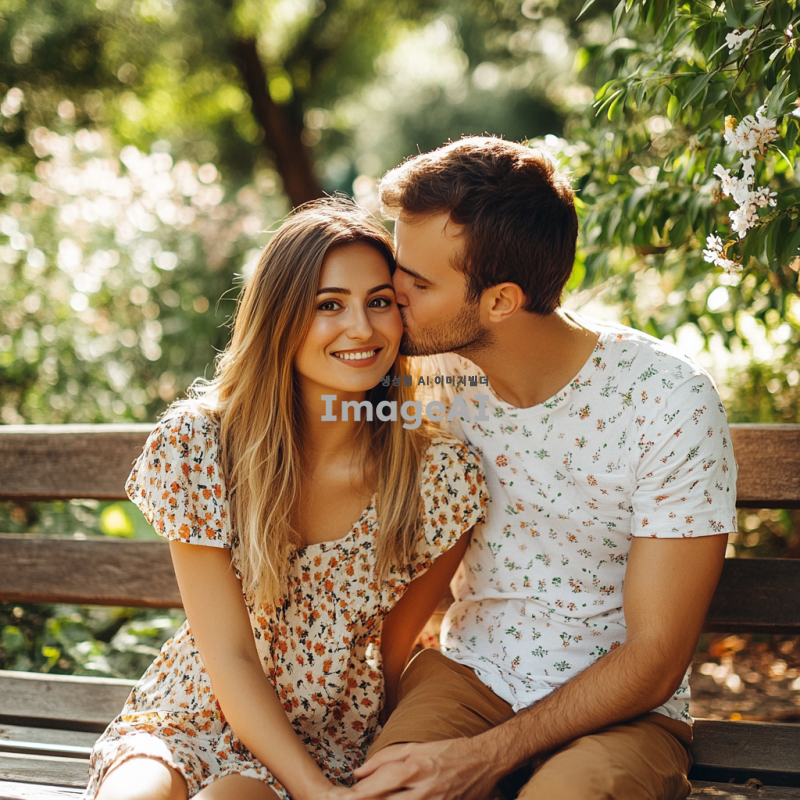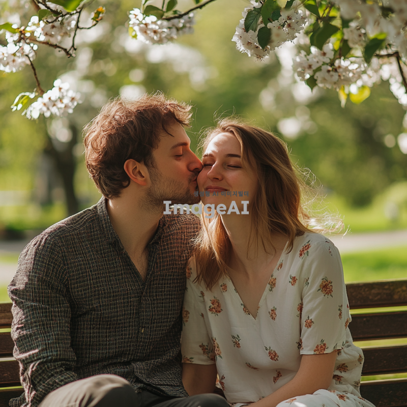 공원 벤치에 앉아 있는 남자와 여자, 남자는 여자의 볼에 뽀뽀하는 순간, 여자는 당황한 표정, 부드러운 햇살이 비치는 따뜻한 오후, 주변에 푸른 나무와 꽃이 피어 있는 장면, 캐주얼한 옷차림, 자연스러운 분위기.