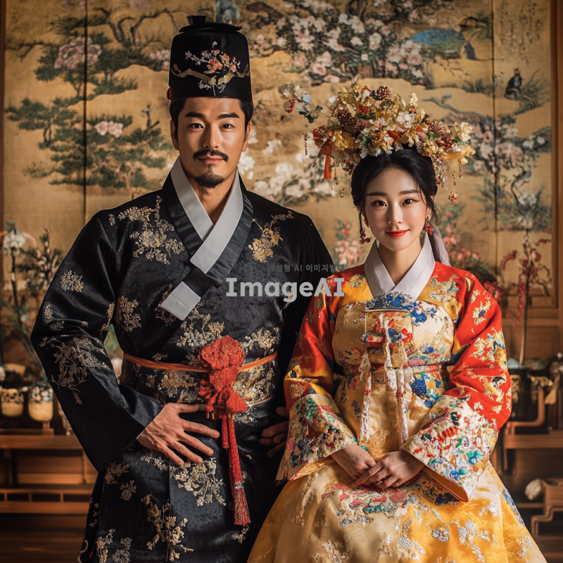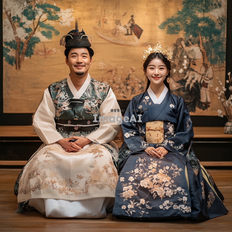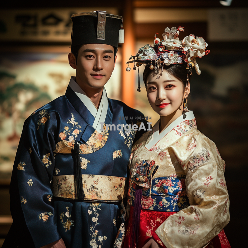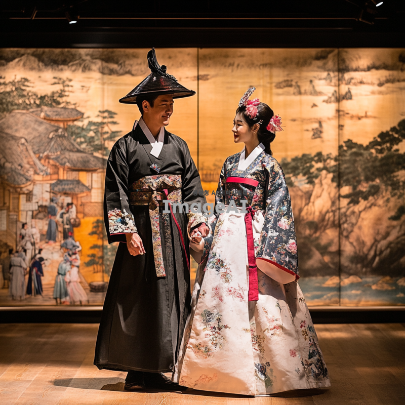 전통적인 한복을 입고 있는 성인 남성과 여성, 성인식 의례를 재현하는 모습, 고풍스러운 박물관 전시회 배경, 섬세한 자수와 화려한 색상의 한복 디테일, 조명에 비친 전통적인 한국 문화의 우아함과 장엄함, 역사적이고 문화적인 분위기 강조.