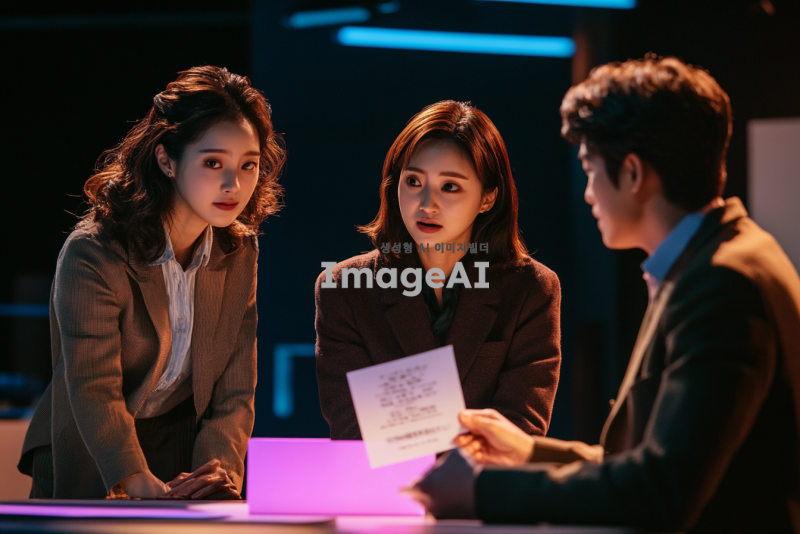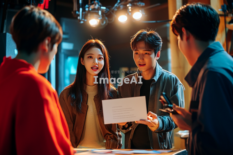 한국인 출연진들이 모여 있는 스튜디오, 테이블 위에 놓인 미션 카드가 담긴 봉투, 출연진들이 호기심 어린 표정으로 봉투를 바라보는 장면, 밝고 활기찬 분위기, 스튜디오 배경은 현대적이고 세련된 디자인, 조명이 부드럽게 비추며 따뜻한 느낌을 주는 장면.
