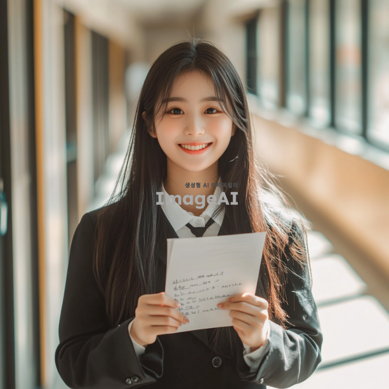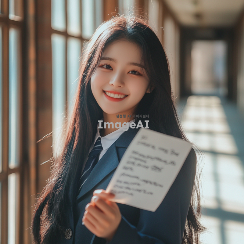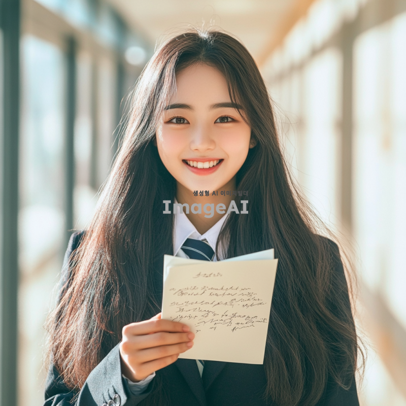 교복을 입고 긴 머리를 가진 여고생이 밝은 미소를 지으며 쪽지를 들고 있는 장면. 배경은 학교 복도이며, 창문을 통해 따뜻한 햇빛이 들어오고 있다. 여고생의 표정은 기쁜 감정을 나타내며, 쪽지에는 손으로 쓴 글씨가 보인다. 교복은 전형적인 한국의 여고생 교복 스타일로, 깔끔하게 정돈되어 있다.