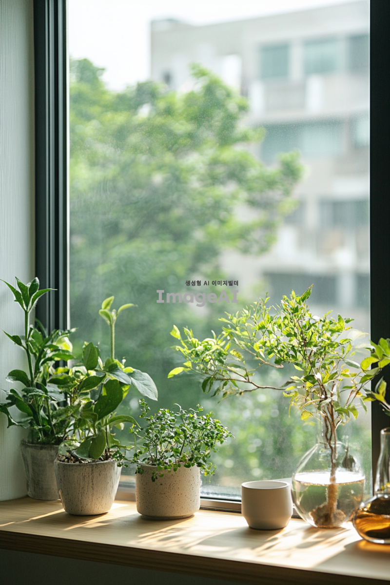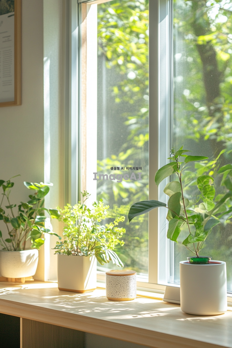 창문에있는 창틀에다가 자연, 정화, 스마트기술을 섞어서 만들어줘