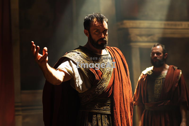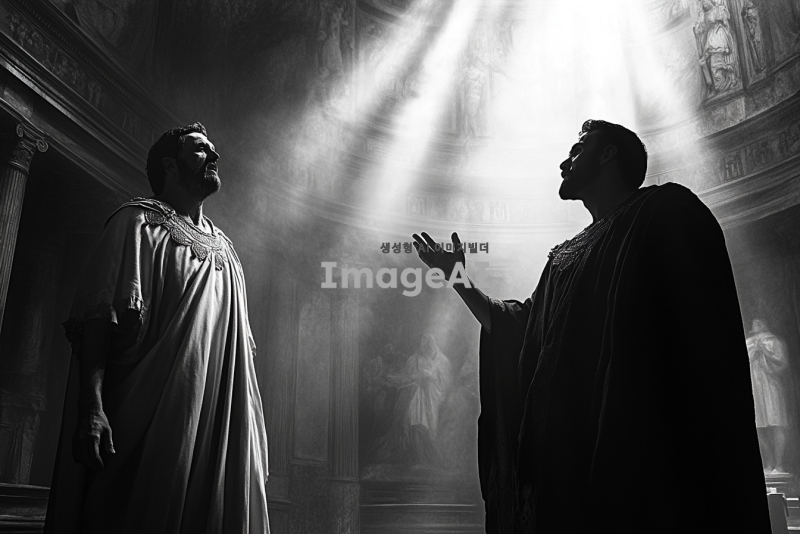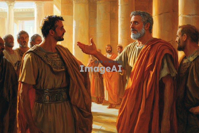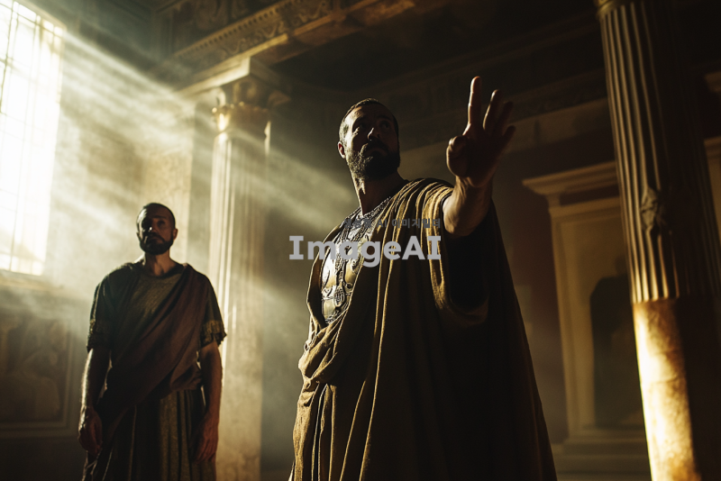 고대 로마 시대의 배경, 웅장한 총독의 관저 내부, 화려한 로마식 건축 양식, 중심에 서 있는 마술사 엘루마, 긴 로브와 신비로운 장신구를 착용, 얼굴에 당혹스러움과 불안함이 드러남, 그의 앞에 서 있는 바울, 결연한 표정과 강한 눈빛, 손을 들어 엘루마를 지적하며 책망하는 모습, 주변에 긴장감이 흐르는 분위기, 관저의 창문을 통해 들어오는 빛이 두 인물을 비추고 있음, 역사적이고 드라마틱한 장면 연출.