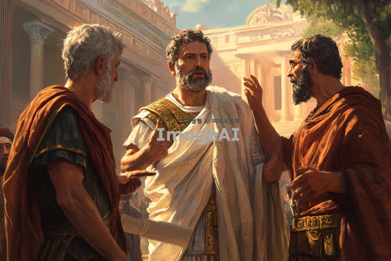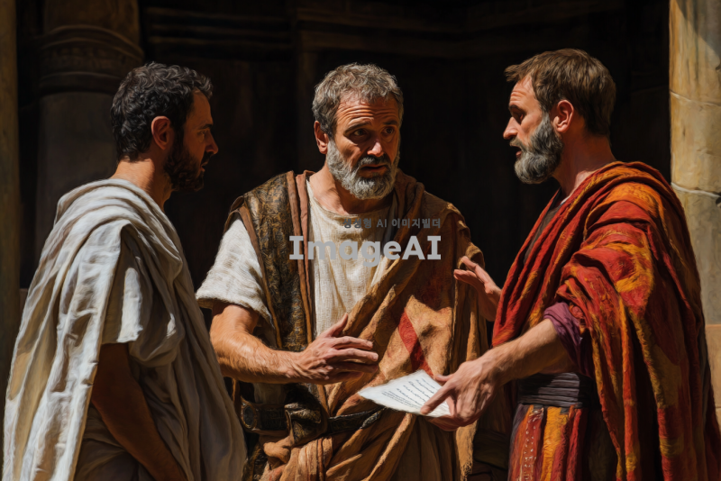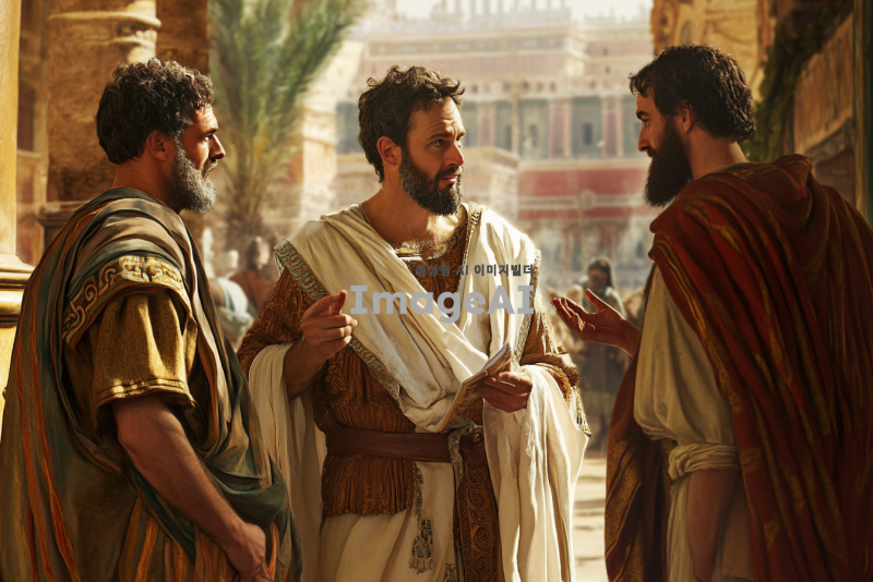 고대 로마 시대의 도시 배경, 세 명의 인물이 중심에 있음. 왼쪽에는 서기오 바울, 중간에는 사도바울, 오른쪽에는 마술사 엘루마. 서기오 바울은 진지하게 사도바울을 바라보고 있으며, 사도바울은 강한 의지를 가진 표정으로 엘루마를 책망하는 모습. 엘루마는 당황한 표정으로 손을 들어 막으려는 자세. 사도바울은 손에 두루마리를 들고 있으며, 엘루마와 서기오 바울 사이의 긴장감이 느껴짐. 고대 로마의 의상을 입고 있으며, 배경에는 로마식 건축물이 보임. 빛이 사도바울에게 비추어 그의 존재감을 강조.