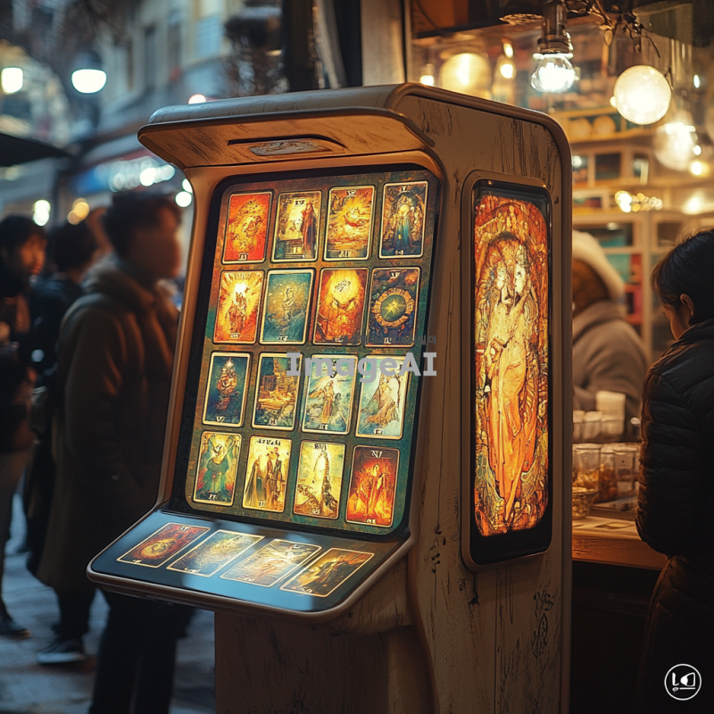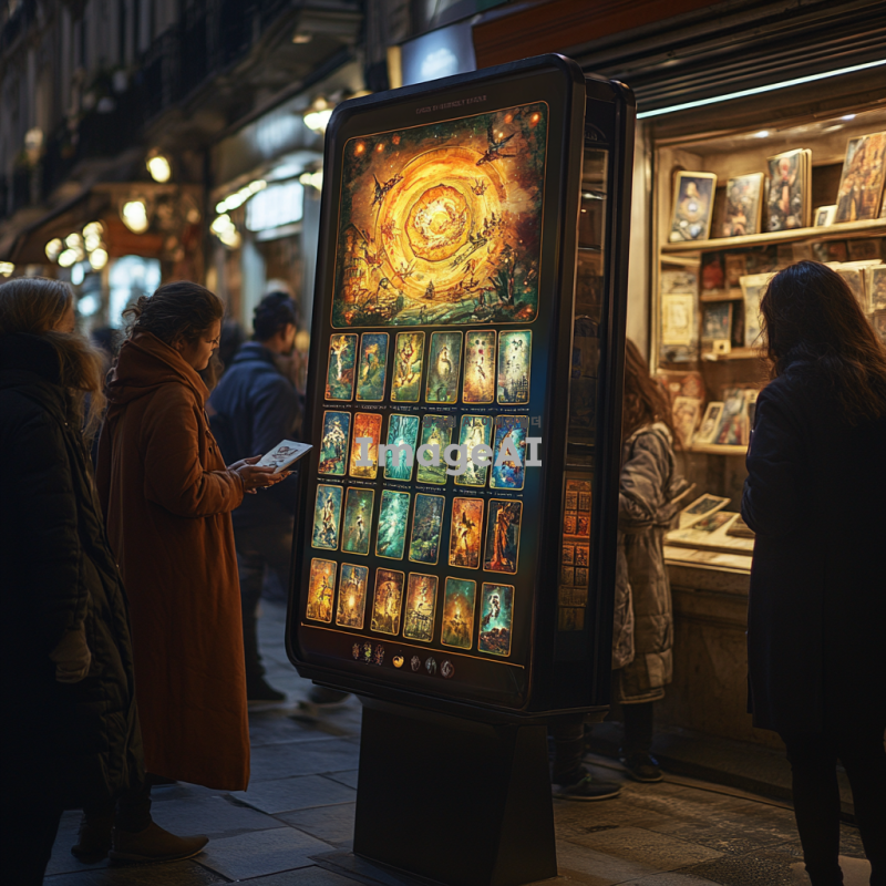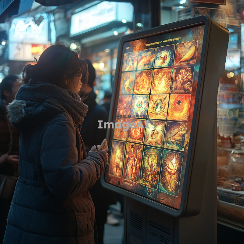 타로카드가 화면에 나타난 키오스크의 실사 이미지. 현대적인 디자인의 키오스크가 도심의 카페나 상점 안에 배치되어 있으며, 다양한 타로카드가 화면에 생생하게 표시되고 있다. 주변에는 사람들이 타로카드를 바라보며 호기심 어린 표정을 짓고 있는 모습이 담겨 있다. 자연광이 들어오는 환경에서 따뜻한 분위기를 연출하고, 키오스크의 디스플레이는 선명하게 보인다.