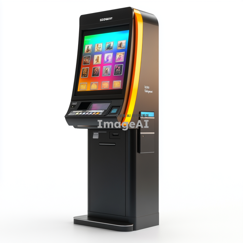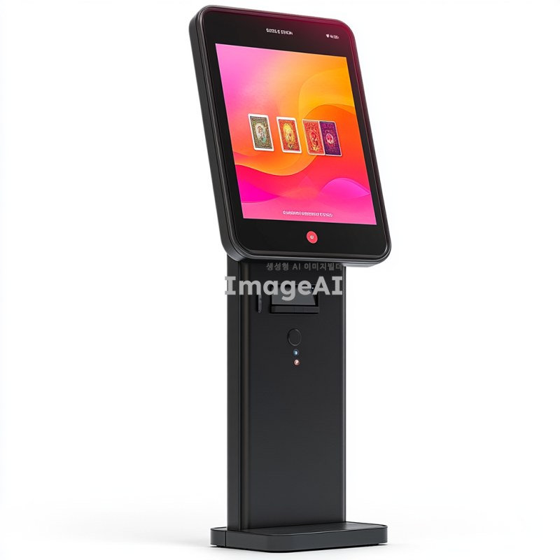세련되고 현대적인 디지털 키오스크로 타로카드가 출력된 LED 디스플레이가 있습니다. 전면에는 카드 및 현금 등록기가 있습니다. 검은색 베이스가 높이 서 있으며, 어떤 각도에서도 보입니다. 상단에는 광고 텍스트나 브랜딩을 위한 공간이 있습니다. 하얀 배경에 고립되어 있습니다.