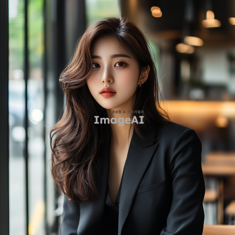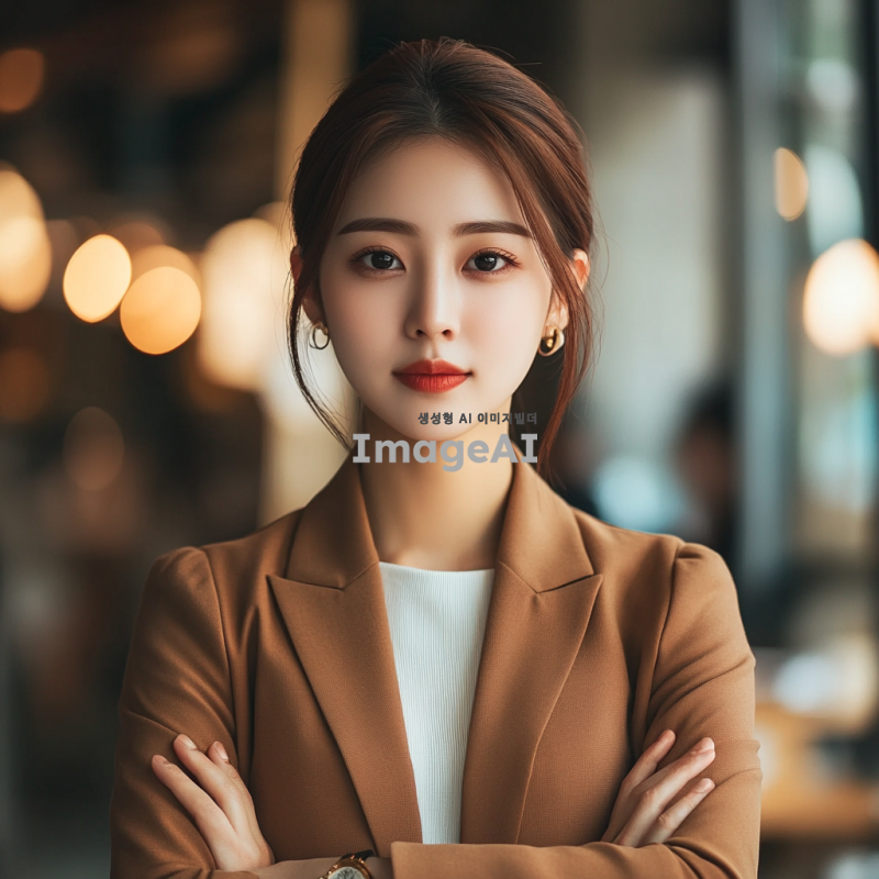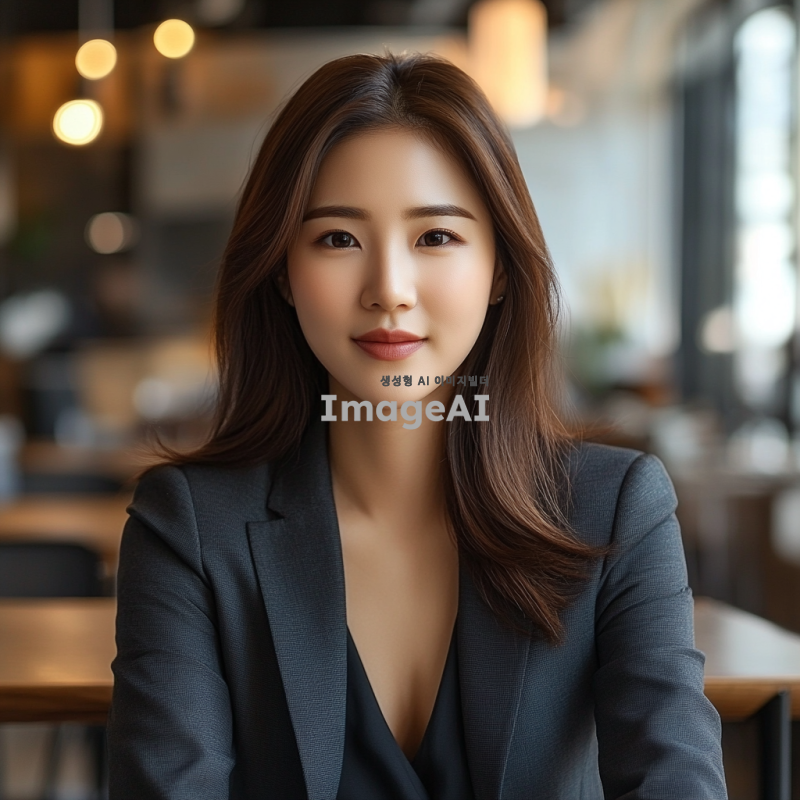 20대의 한국인 여성, 여성미가 강조된 모습, 세련된 직업복을 입고 있으며 과한 노출은 피하면서도 매력적인 포즈를 취하고 있는 모습. 하얀 피부와 건강한 머릿결을 가진, 자신감 넘치는 표정으로 카메라를 바라보고 있는 장면. 배경은 도시적인 느낌의 세련된 카페나 사무실로 설정.