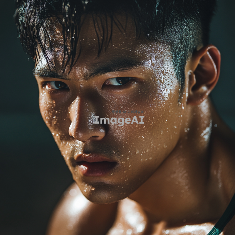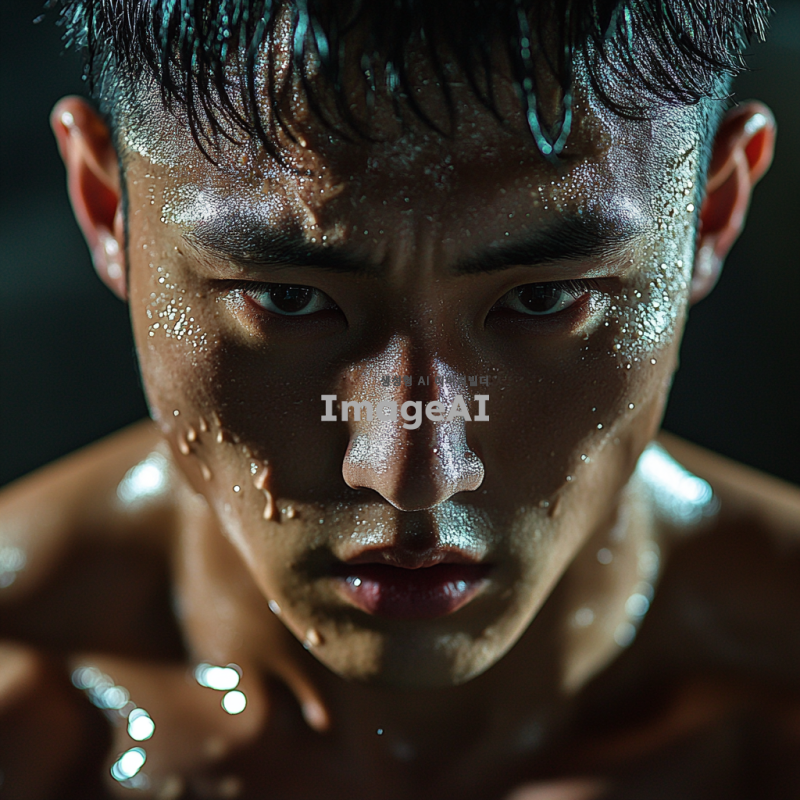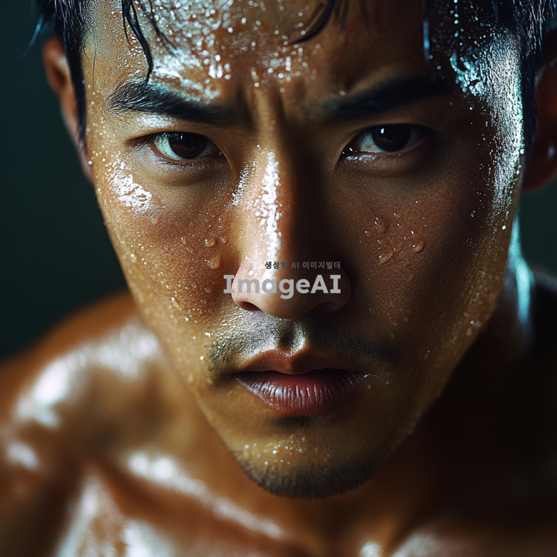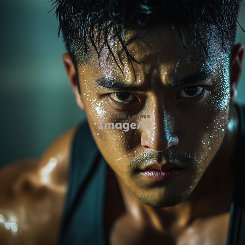 운동 중인 한국 남성의 얼굴, 땀방울이 맺혀 있고 강렬한 표정, 헬스장 배경, 근육질의 체격, 운동복 착용, 집중하는 모습, 자연광이 비치는 환경, 역동적인 느낌 강조