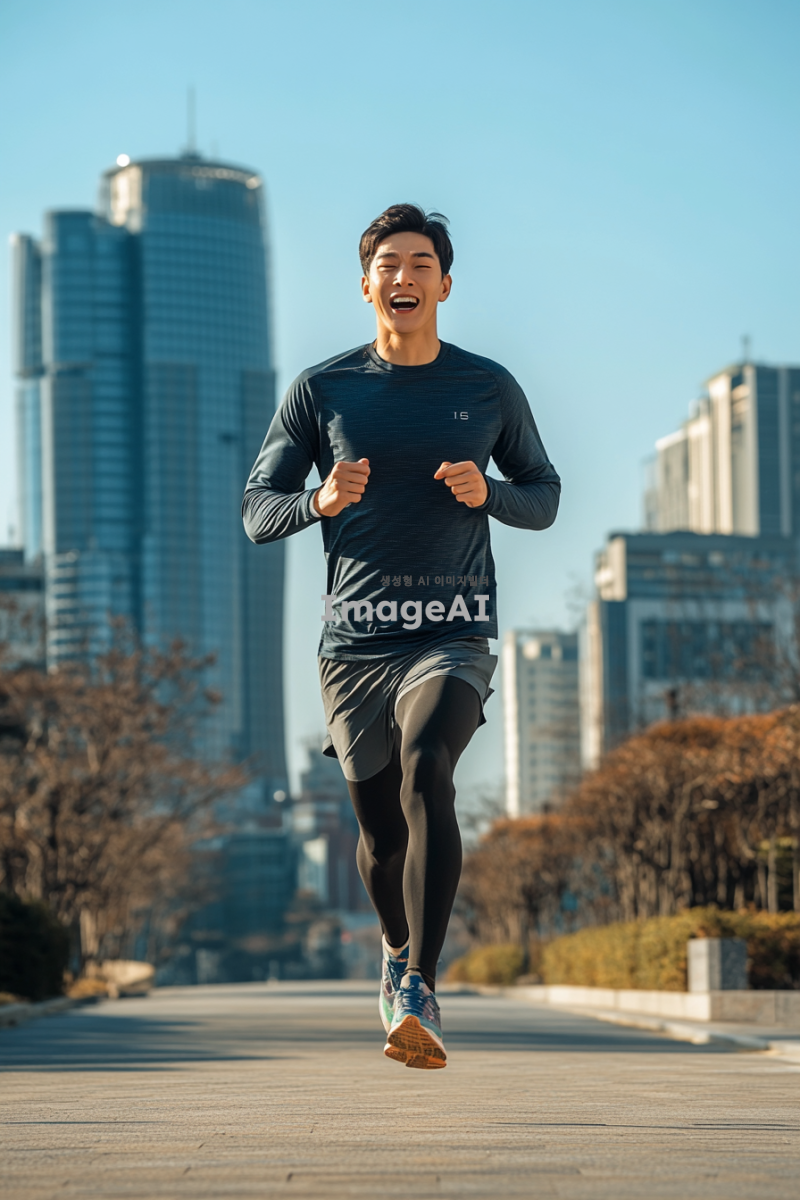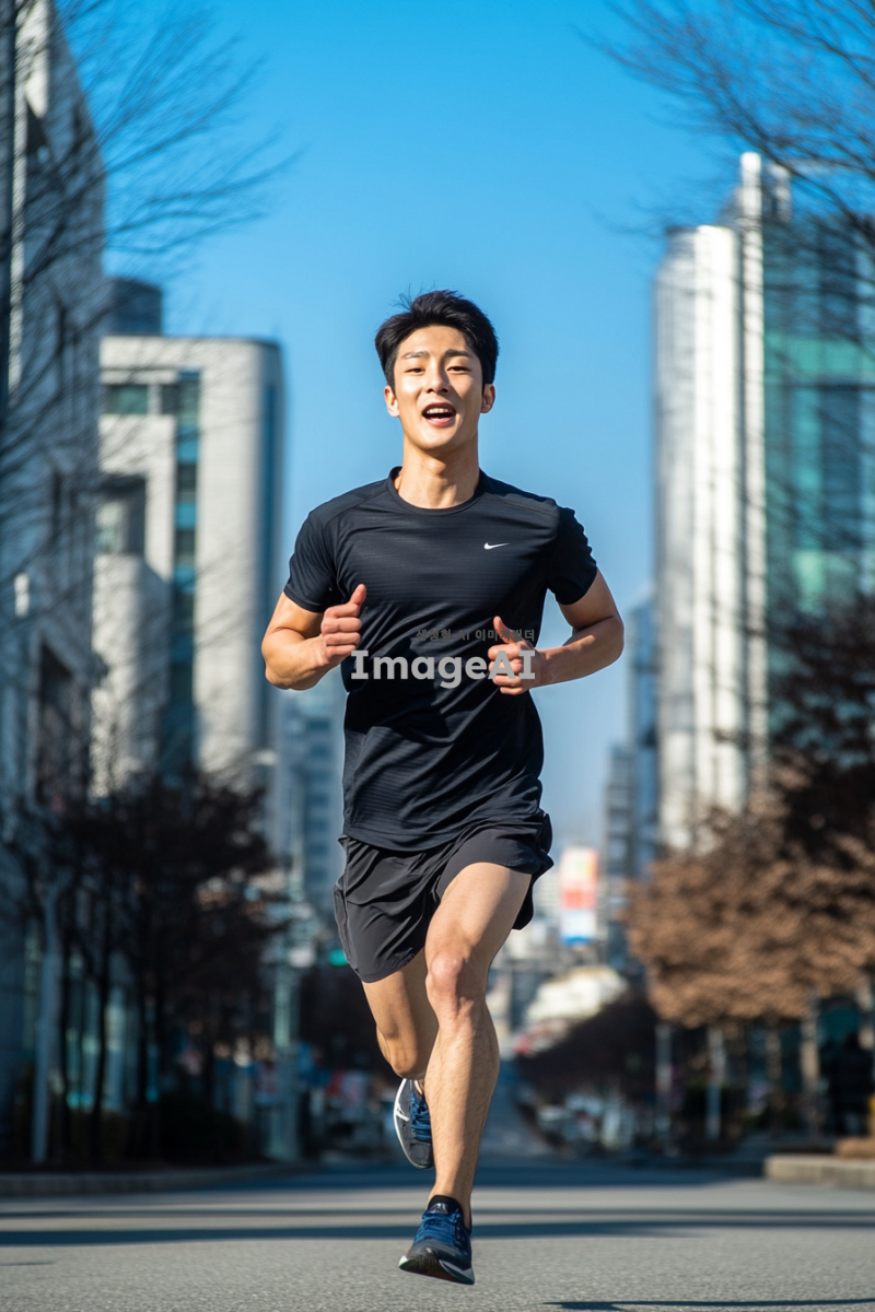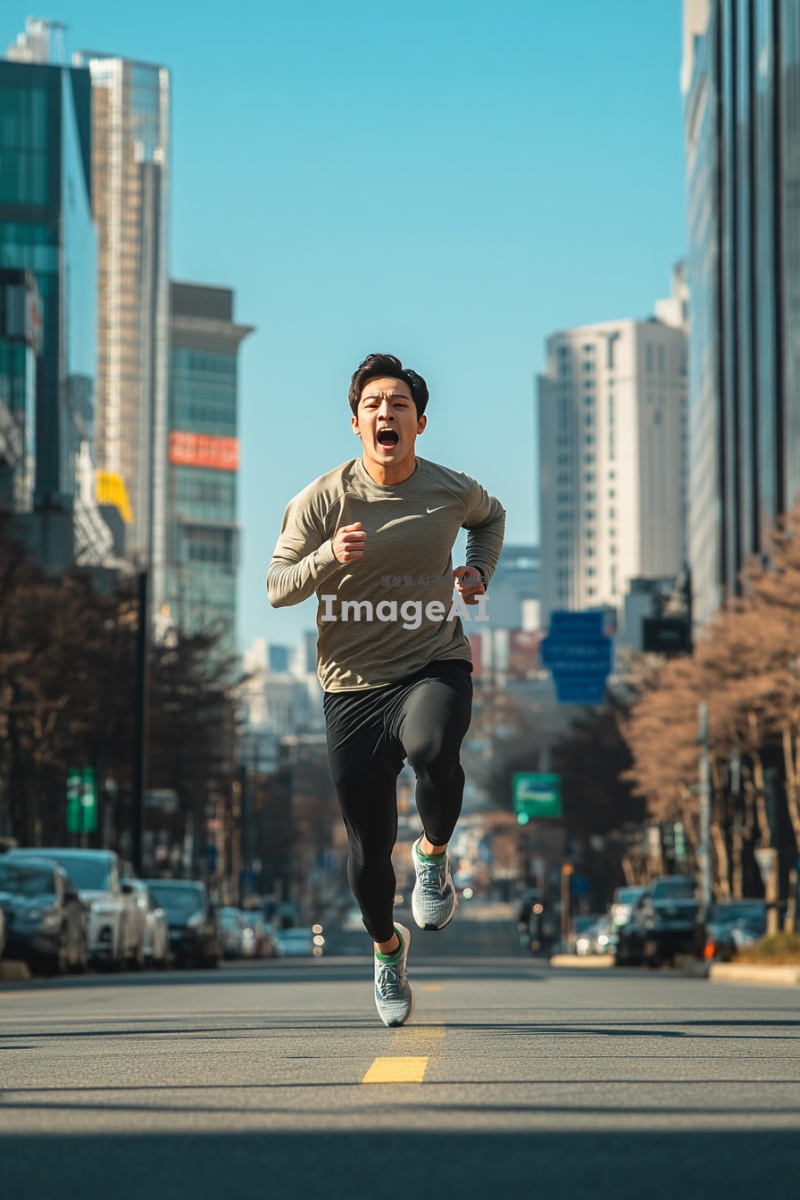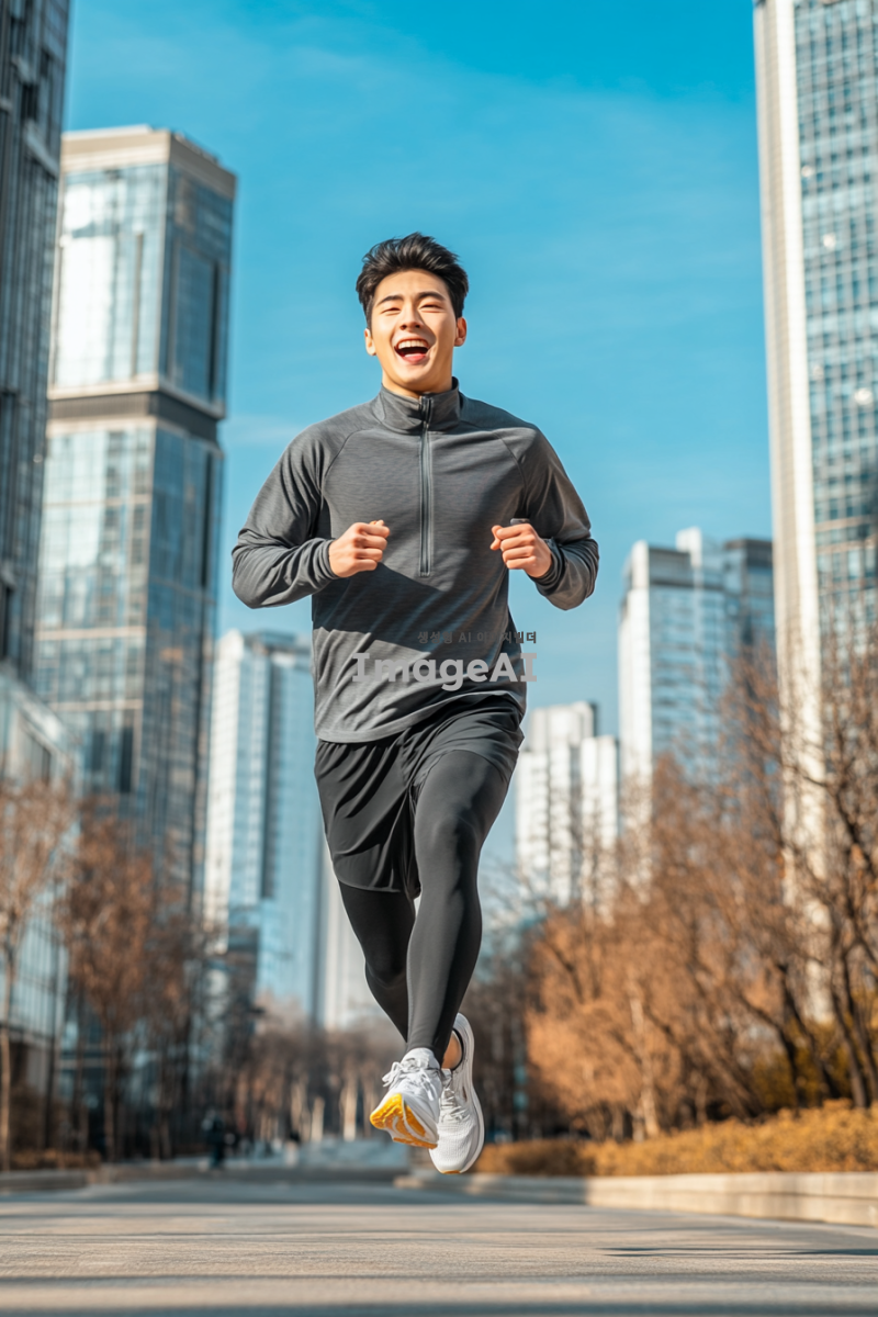 한국의 도시 거리에서 빠르게 달리는 남성, 운동복을 입고 신나는 표정으로 달리고 있는 모습, 배경에는 현대적인 건물과 푸른 하늘이 어우러진 풍경, 역동적인 포즈와 에너지를 강조한 장면.