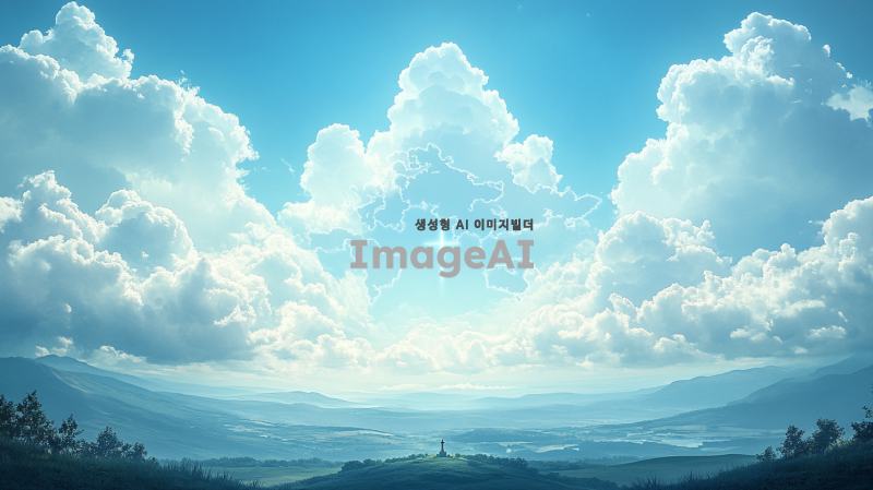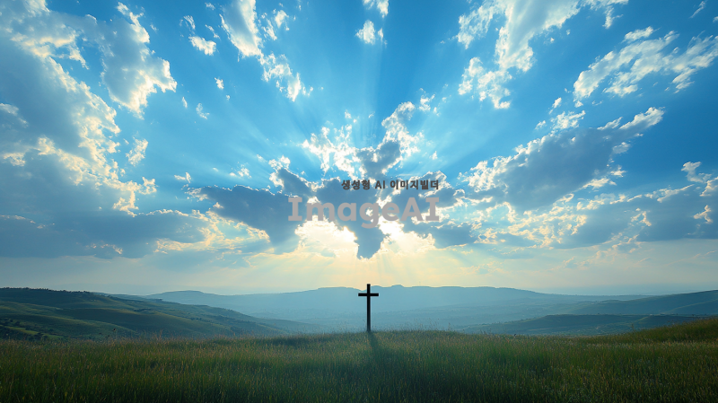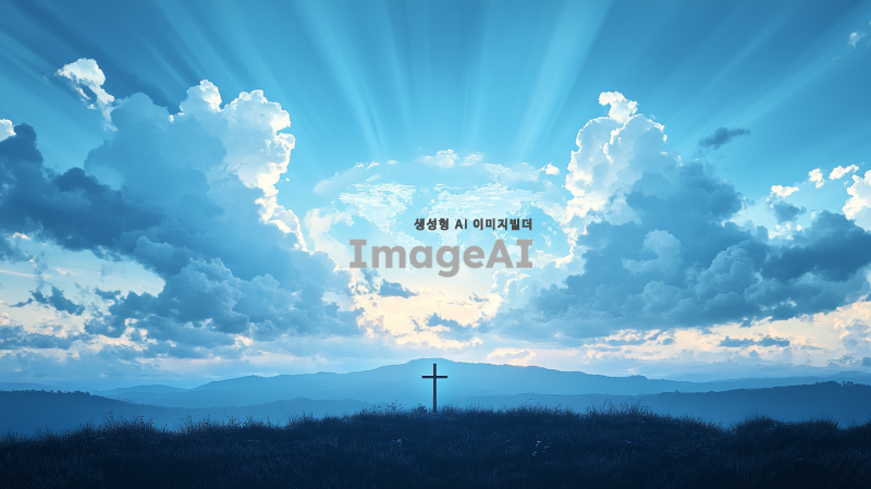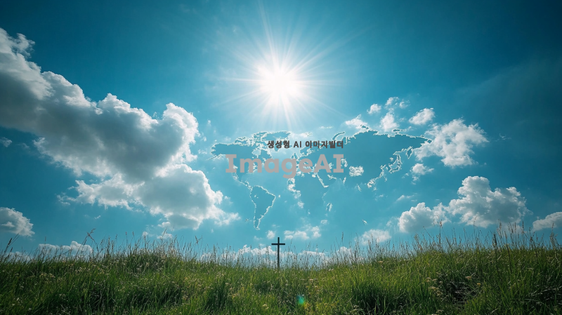 푸른 하늘과 흰 구름이 떠 있는 아름다운 풍경, 세계지도 모양의 구름, 중앙에 흐리게 비치는 십자가 실루엣