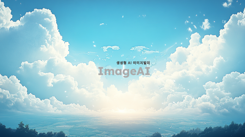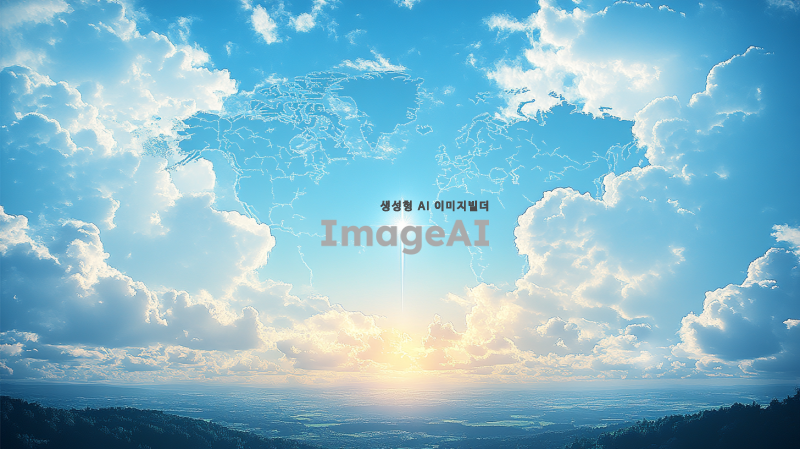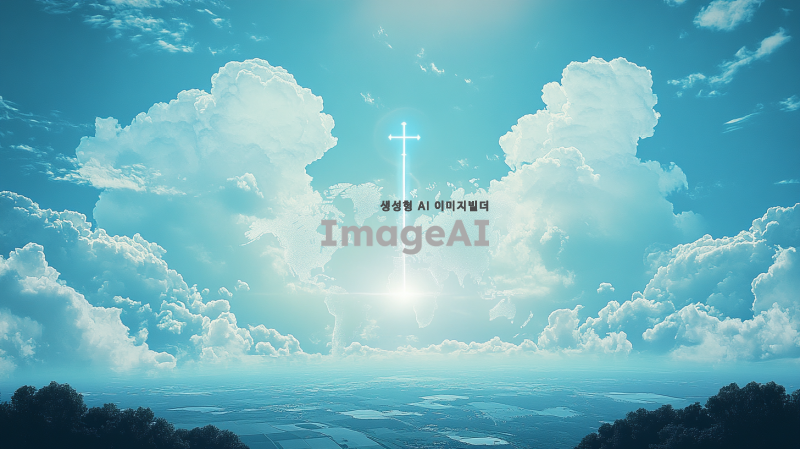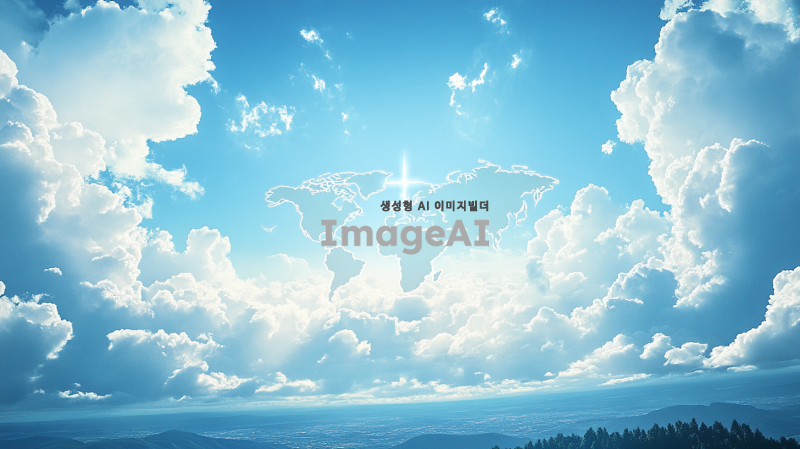 푸른 하늘에 흰 구름이 떠 있는 풍경, 세계지도 실루엣, 중앙에서 십자가 모양 빛이 비침