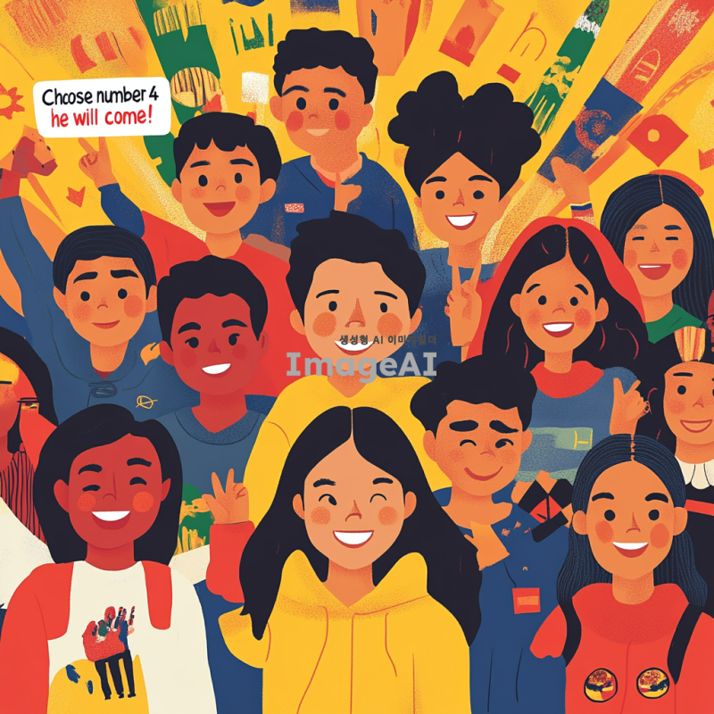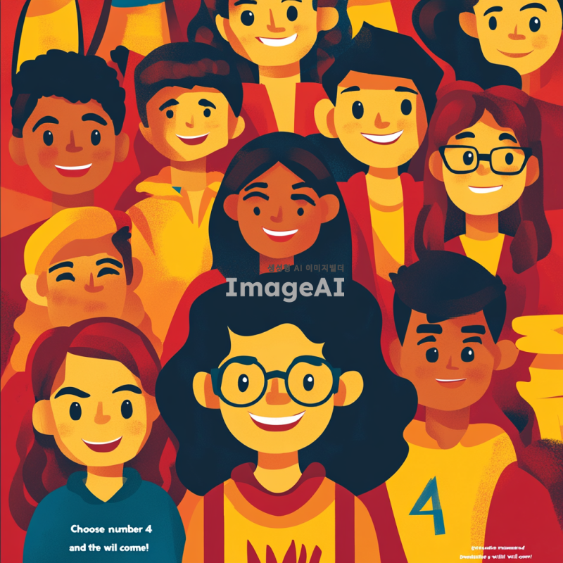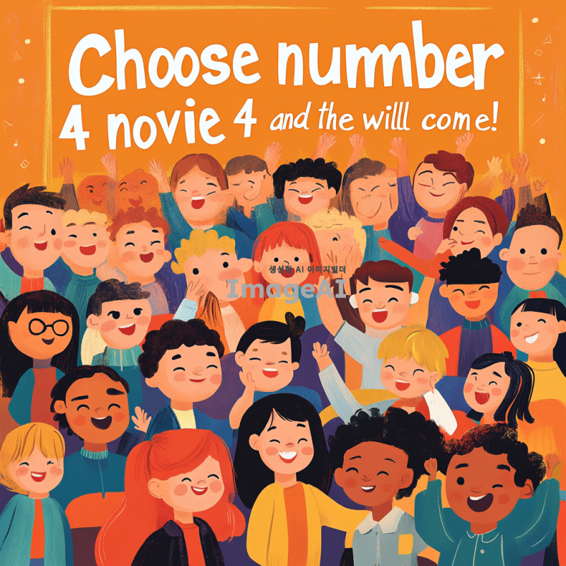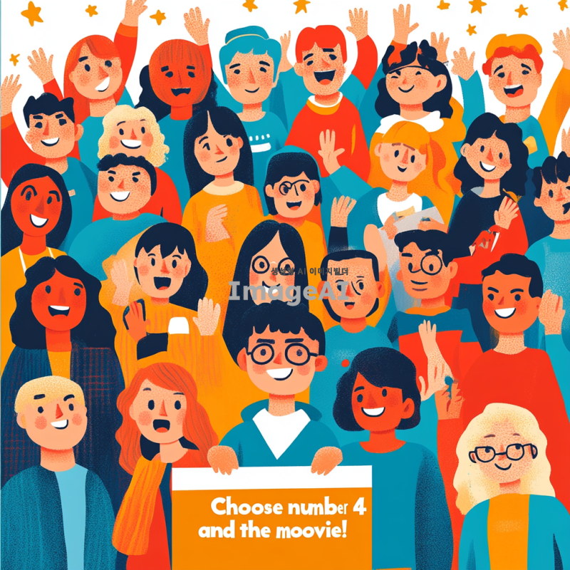 특별한 학교의 포스터 디자인, 학생들이 함께 즐기는 모습, 영화관람을 기대하는 표정, 다양한 인종의 학생들이 모여 있는 모습, 밝고 화사한 색감, 학교의 이름을 강조한 디자인 요소, 영화 관련 아이콘이나 그래픽 추가, "4번을 선택하면 영화가 찾아옵니다!"라는 문구를 중심으로 배치, 아늑하고 즐거운 분위기.회장선거에 이용할 포스터.