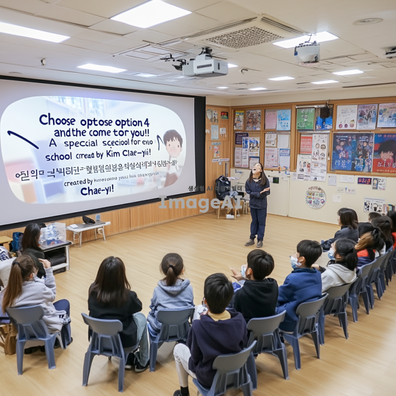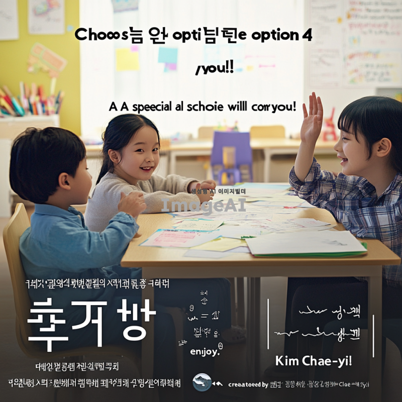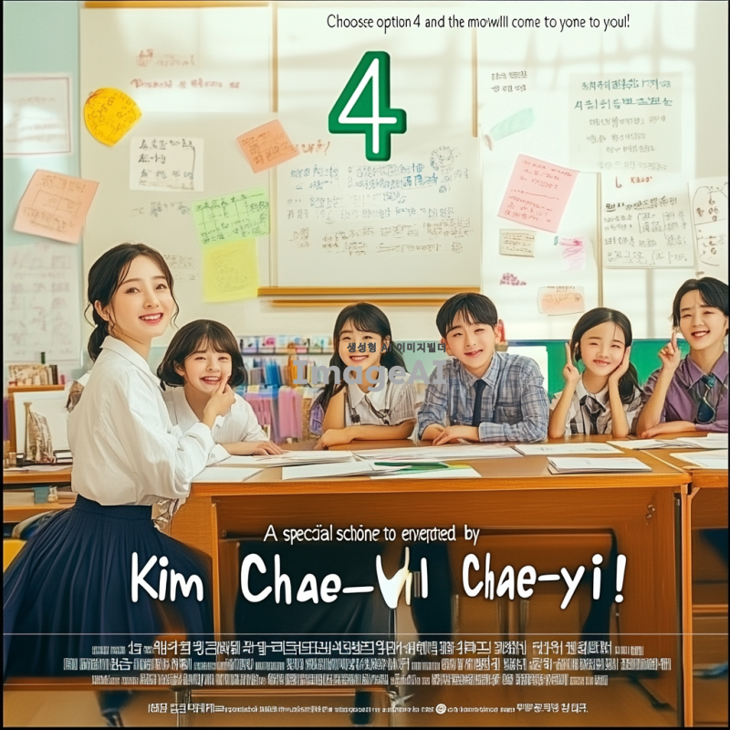 "4번을 선택하면 영화가 찾아옵니다! 다 함께 즐기는 특별한 학교, 김채이가 만듭니다!"이 문구로 포스터를 그리기.