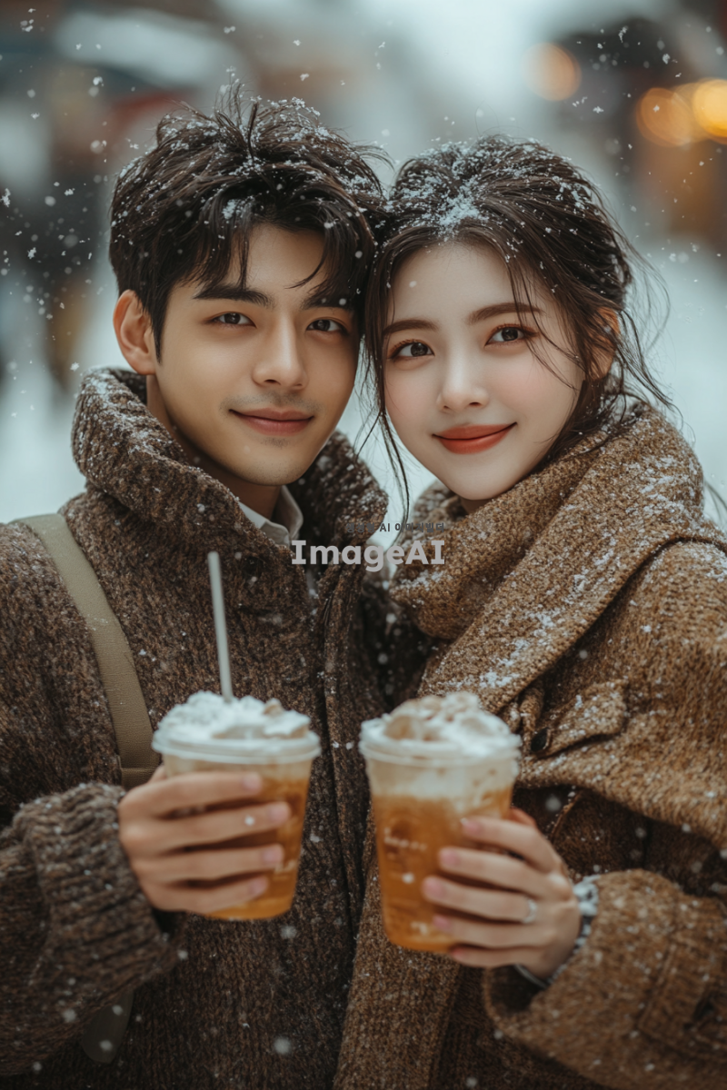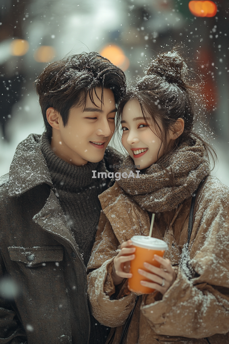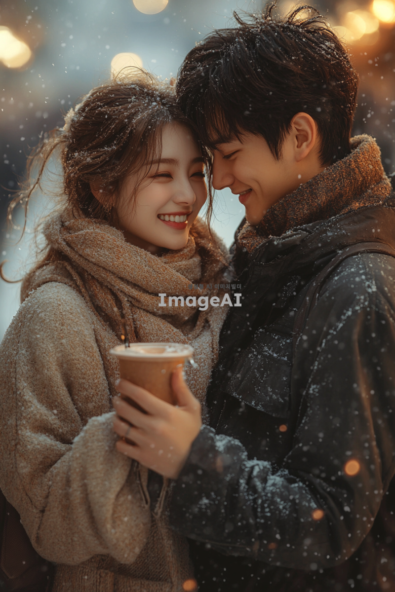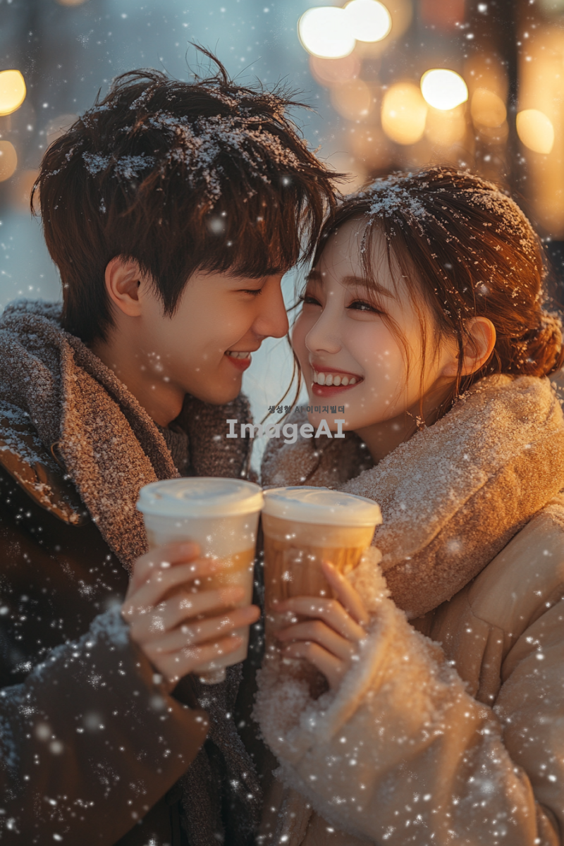 눈이 내리는 겨울 풍경 속에서 따뜻한 옷을 입고 있는 한국인 커플이 서로의 어깨에 기대어 있는 모습. 커플은 웃고 있으며, 손에는 따뜻한 음료를 들고 있다. 배경에는 하얀 눈으로 덮인 나무와 겨울의 차가운 공기가 느껴지는 거리 풍경이 펼쳐져 있다. 커플의 행복한 표정과 따뜻한 분위기가 강조된 장면.