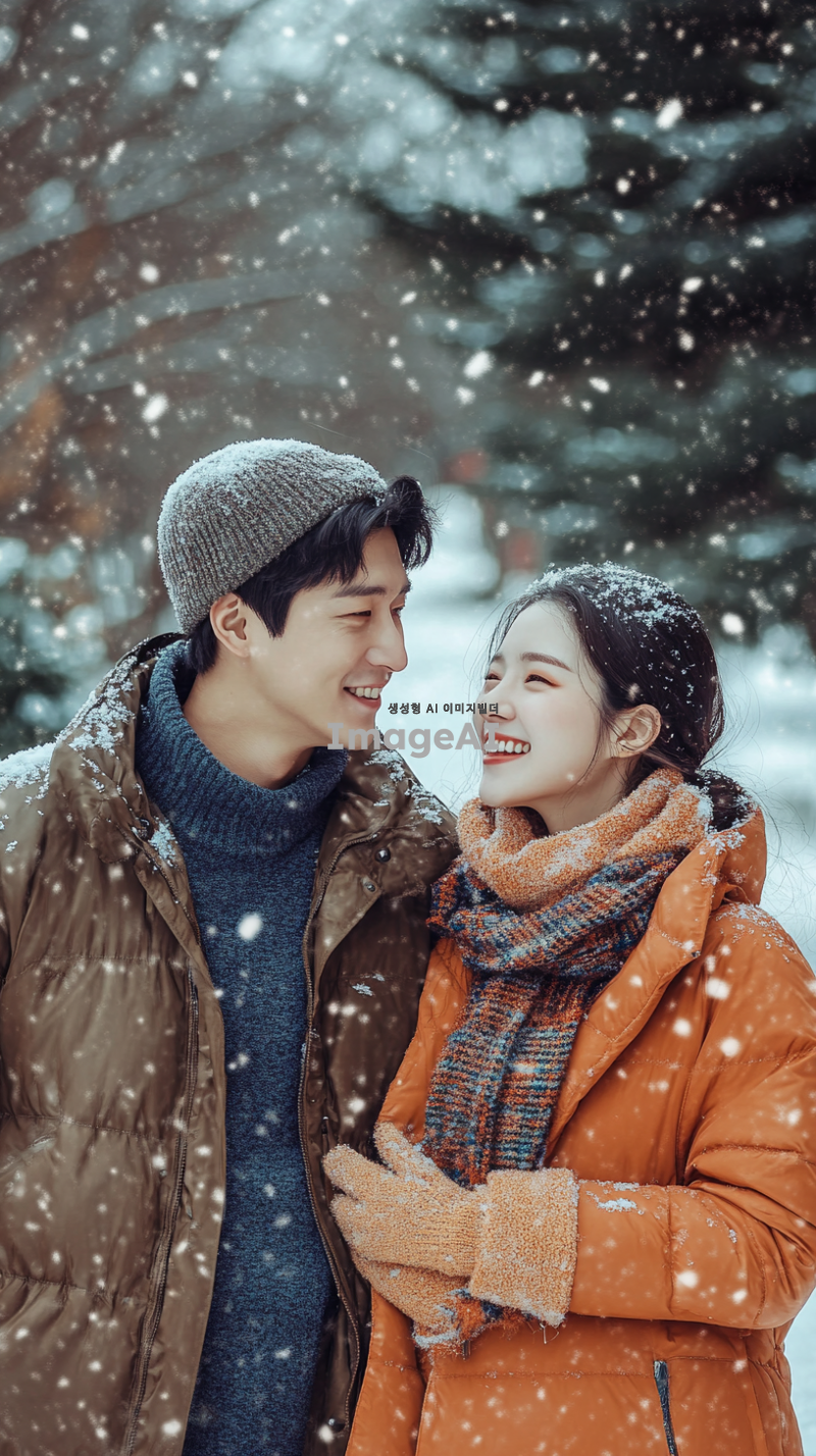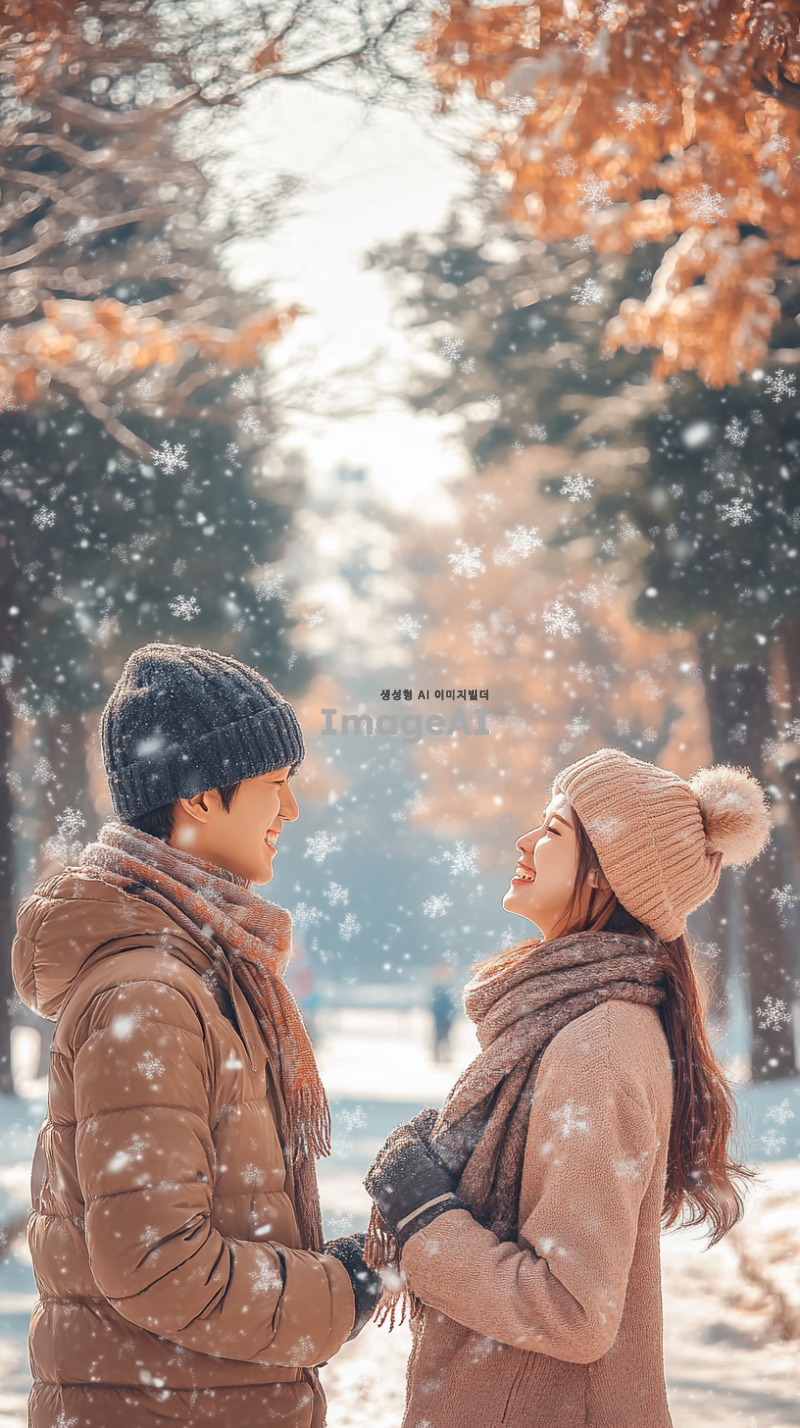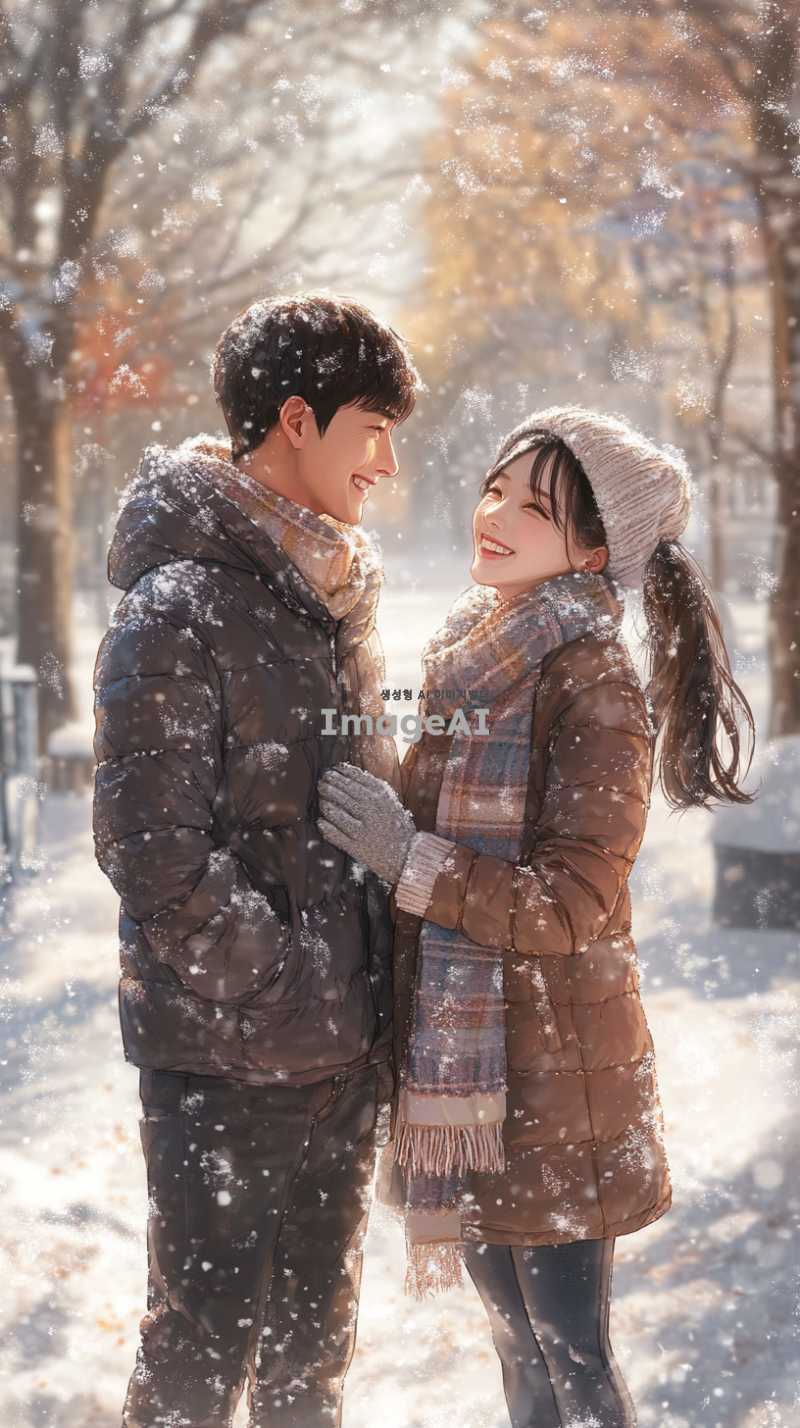 겨울의 눈 덮인 공원에서 서로를 바라보며 따뜻하게 웃고 있는 한국인 커플의 전신 모습. 남자는 따뜻한 패딩과 모자를 착용하고 있고, 여자는 스카프와 장갑을 끼고 있다. 둘 다 눈송이가 내리는 가운데 사랑스러운 포즈를 취하고 있으며, 배경에는 나무와 눈으로 덮인 길이 보인다.