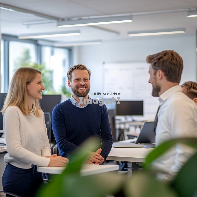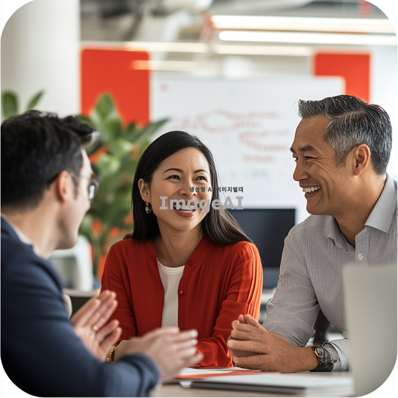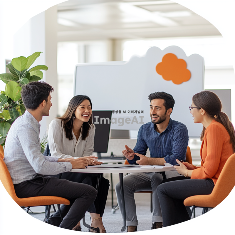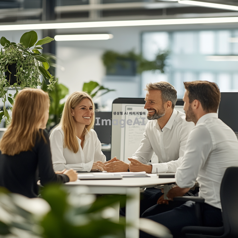현대식 화이트톤의 잘 정돈된 사무실에서 깔끔한 복장을 한 남녀 직원 4명이 밝은 미소를 지으며 회의를 하고 있는 모습. 직원들은 서로의 의견을 경청하며 활발하게 대화하고 있으며, 배경에는 화이트 보드와 컴퓨터, 식물이 배치되어 있어 아늑하고 전문적인 분위기를 자아내고 있음.
