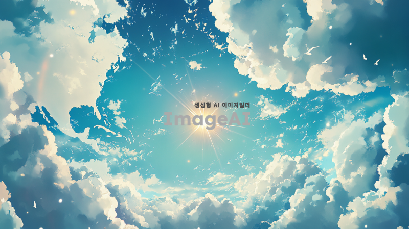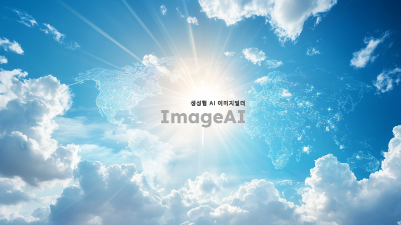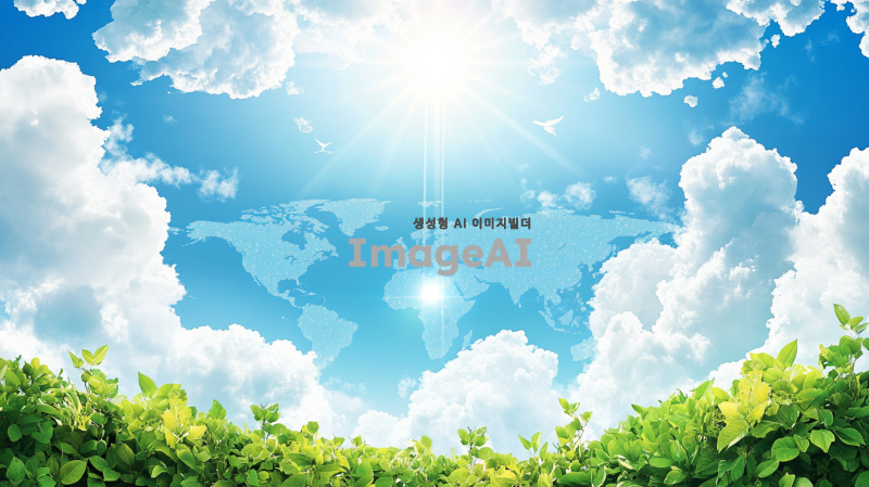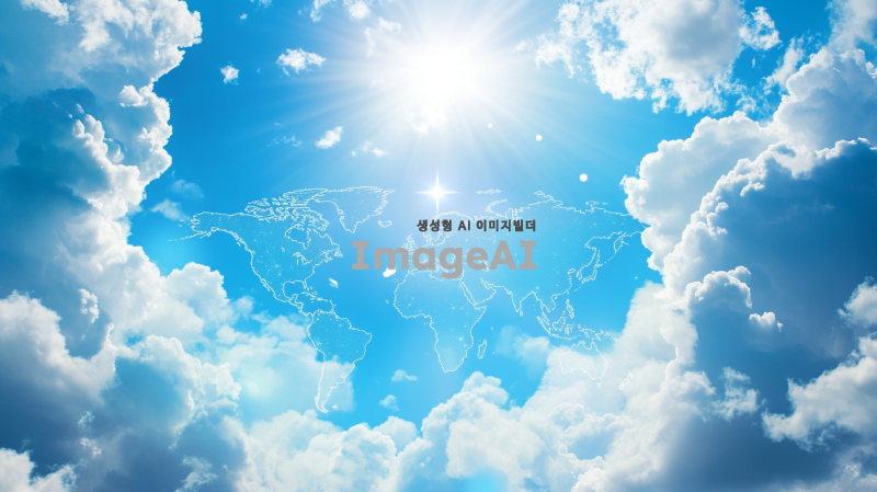 푸른 하늘에 흰 구름이 떠 있는 풍경, 햇살이 비치는 따뜻한 날씨, 세계지도 실루엣, 중앙에서 환하게 비치는 십자가 빛