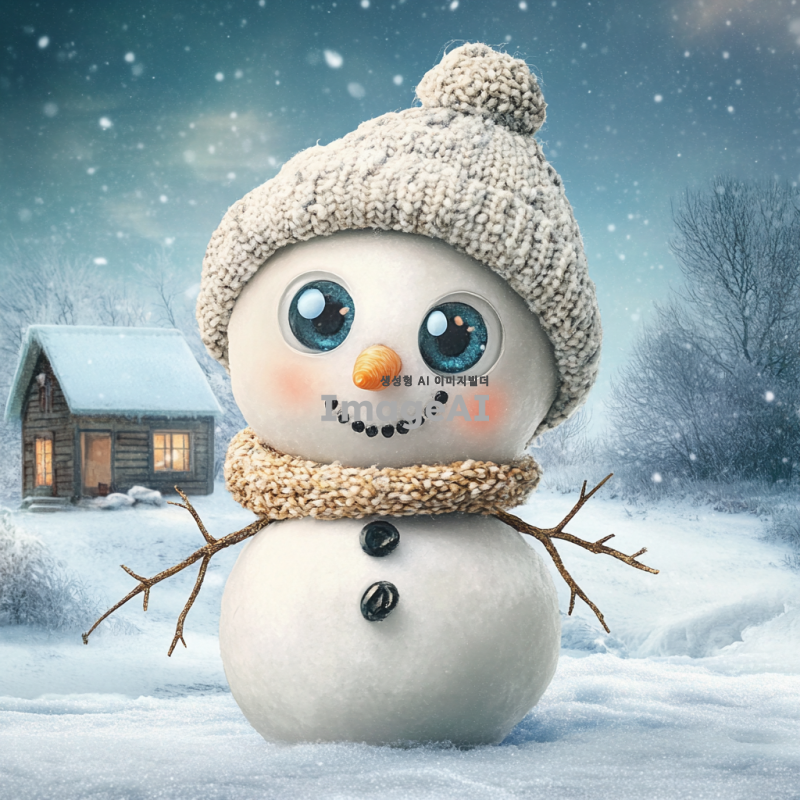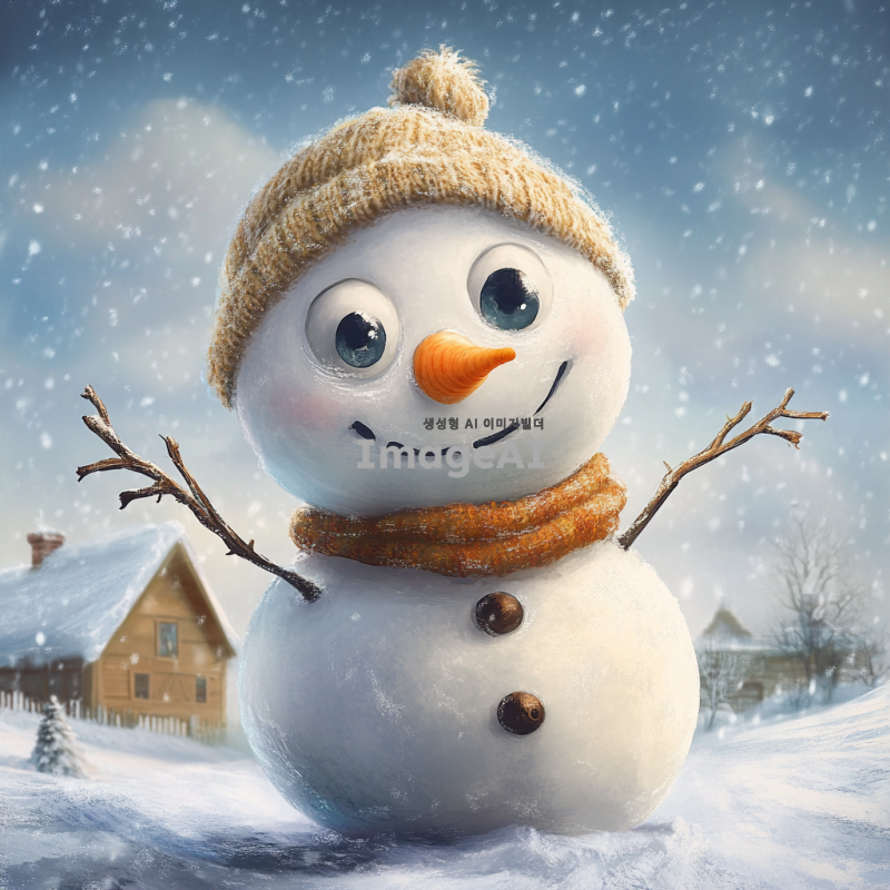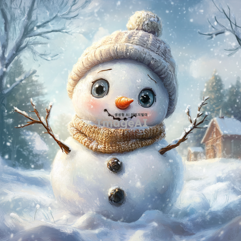 눈사람 캐릭터를 디자인해줘. 귀여운 표정과 함께 눈사람의 몸은 두 개의 큰 눈으로 구성되어 있고, 모자는 따뜻한 털모자와 목도리를 하고 있어. 눈사람의 손은 나뭇가지로 만들어졌고, 주변에는 눈이 쌓인 겨울 풍경이 펼쳐져 있어. 배경에는 눈 내리는 하늘과 함께 작은 집이 보인다. 전체적으로 아기자기하고 따뜻한 느낌을 주는 이미지로 만들어줘.