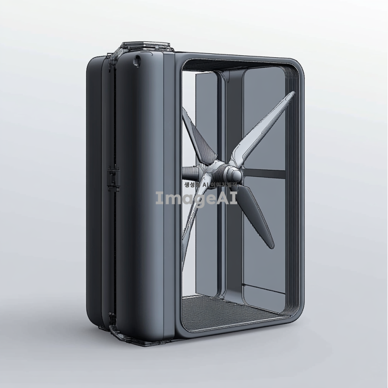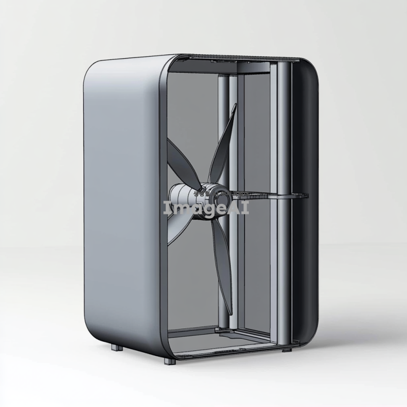 단순한 풍력 터빈 지지대의 디자인, C4D 스타일의 고체 모델. 프레임은 검은 금속 재질로 만들어졌으며 앞면과 상단 표면에는 회색 플라스틱 창이 있다. 한쪽 끝에는 풍력 터빈을 보관할 수 있는 평면 문이 열리도록 되어 있다. 제품은 고립된 흰색 배경에 놓여 있다. 전체적인 형태는 열린 정사각형 상자와 유사하다. 다른 자세한 정보는 없다.