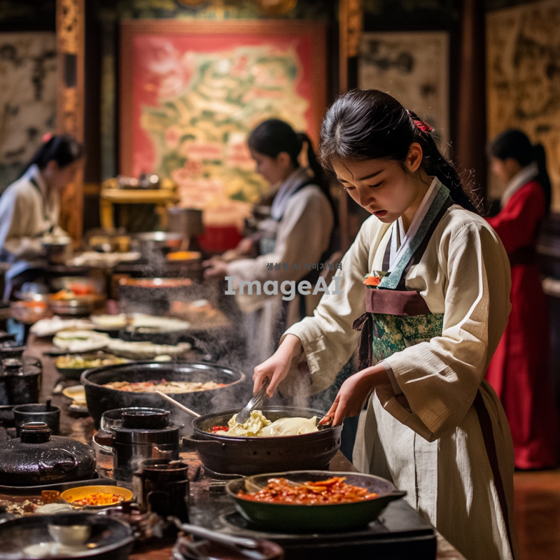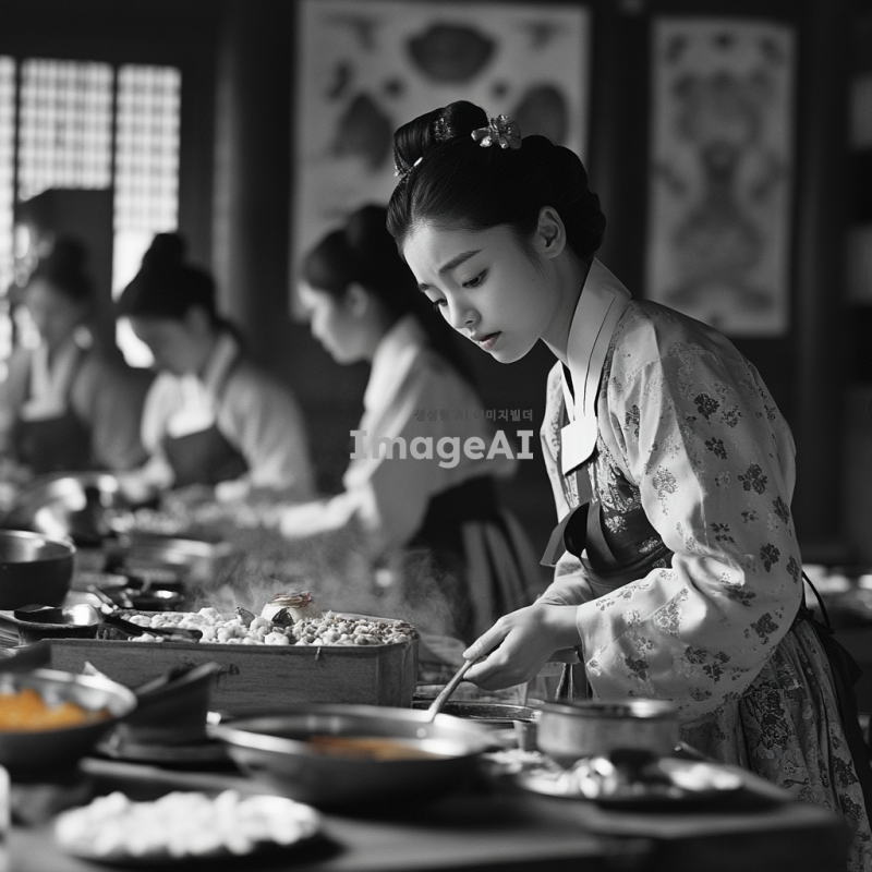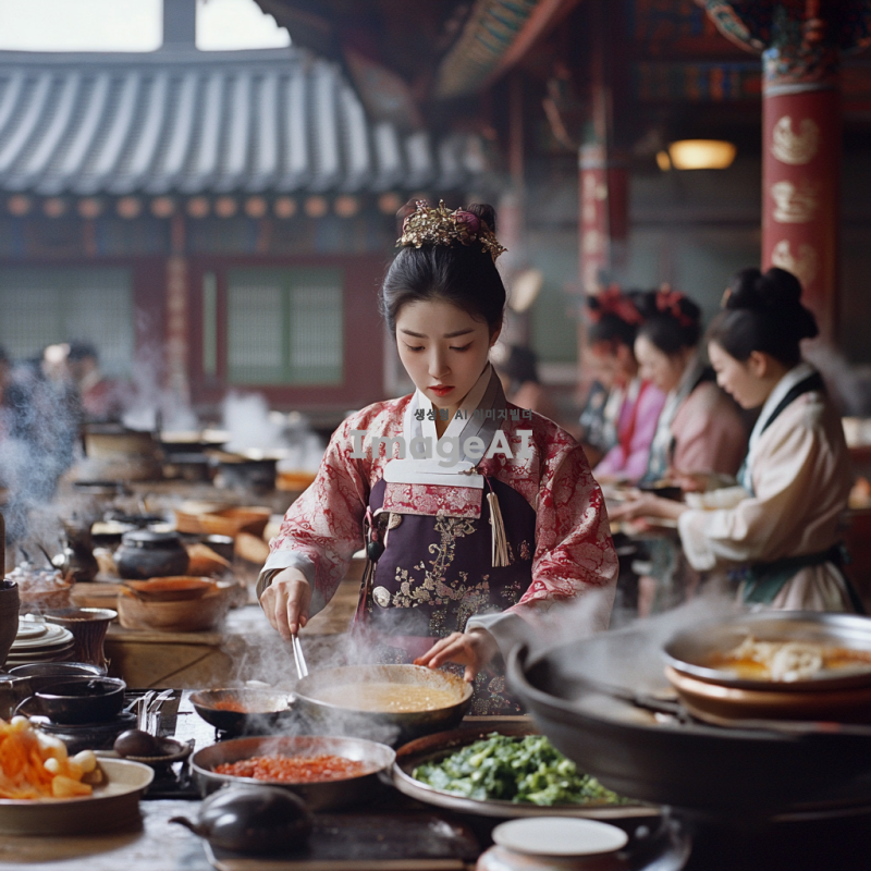 조선시대 궁궐 수랏간의 내부, 점심식사를 준비 중인 어린 궁녀가 바쁜 표정으로 땀을 닦으며 요리를 하고 있는 모습. 수랏간에는 여러 궁녀들이 각자 요리를 하거나 음식을 운반하며 분주하게 움직이고 있다. 궁녀의 눈빛에는 호기심과 두려움이 섞인 감정이 담겨 있다. 전통적인 한복을 입고 있으며, 수랏간의 다양한 조리 도구와 식재료가 배치되어 있다. 배경에는 궁궐의 화려한 장식과 전통적인 요소들이 보인다.