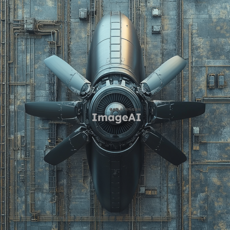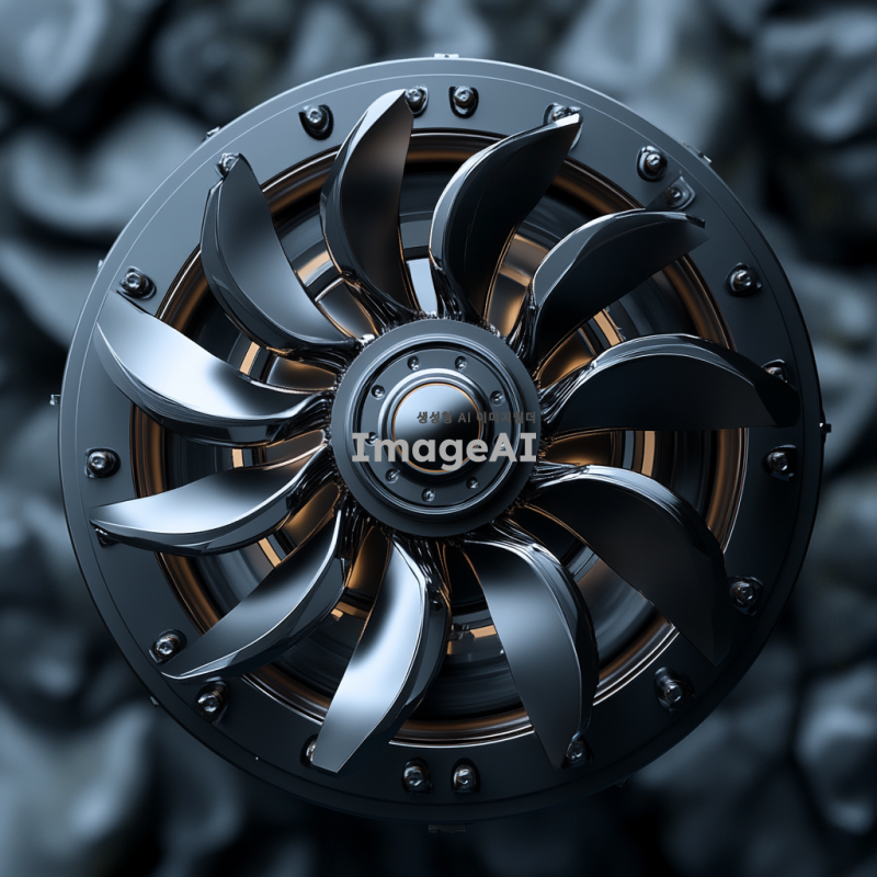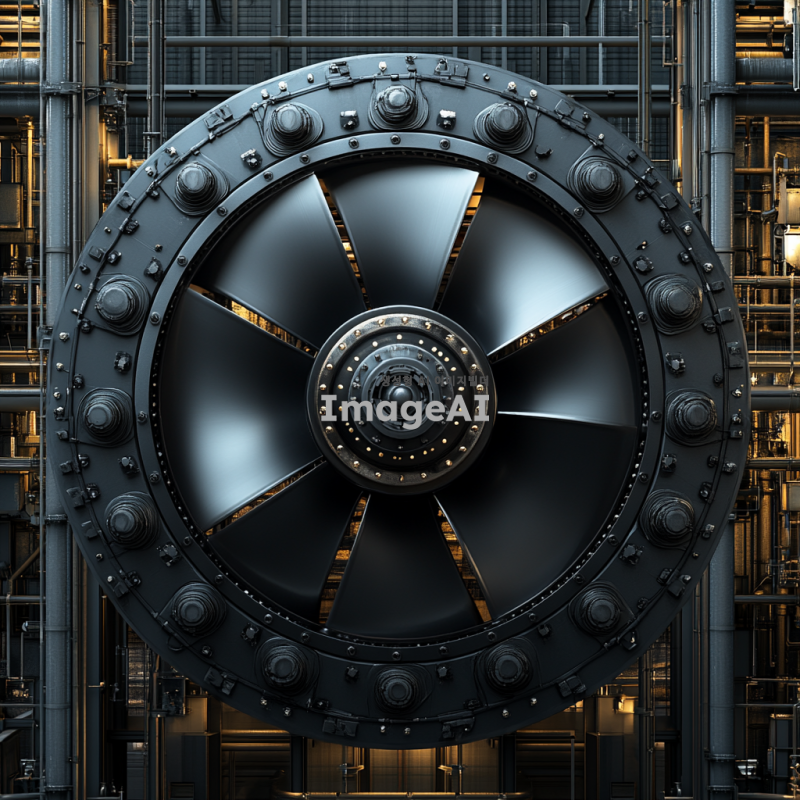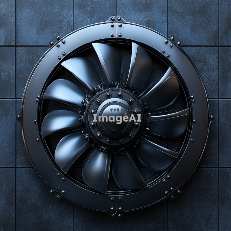 산업용 풍력 터빈의 3D 제품 디자인, 금속 외 shell과 날개가 특징. 디자인에는 수직 팬을 감싸는 커버가 설치되어 있으며, 공장 배경에 설정됨. 제품은 위에서 아래로 바라본 시점에서 보여지며, 단단한 표면과 검은색 색조로 산업 스타일을 반영. 사실적 이미지